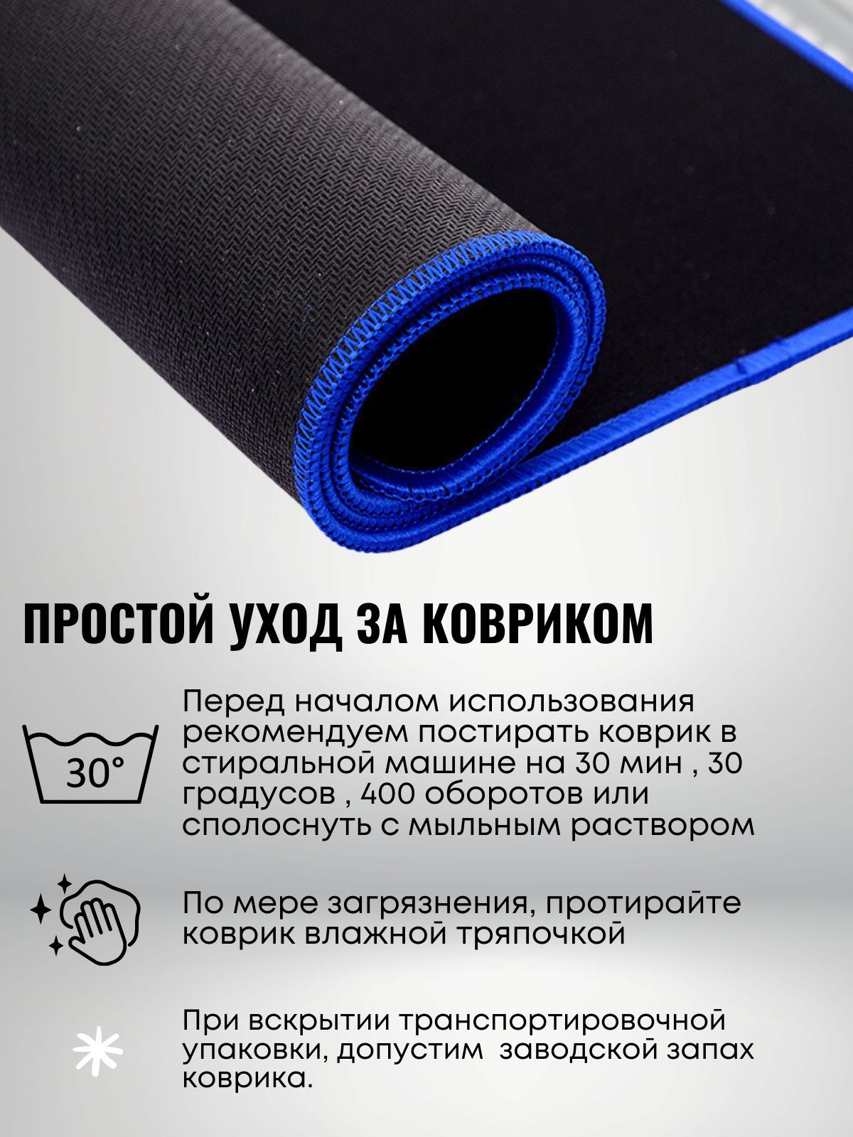 Особенности коврика: Водоотталкивающая поверхность, Нескользящая основа, Прошитые края