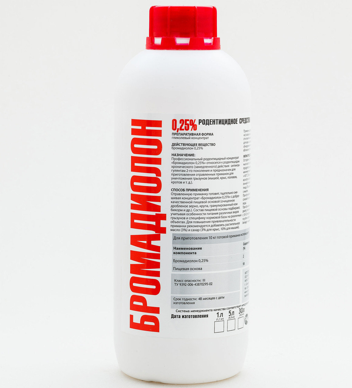 Для дальнейшего хранения и транспортировки приготовленную приманку раскладывают в закрывающуюся тару с этикеткой. Текст этикетки на таре со средством Бромадиолон 0,25% или приманкой обязательно должен содержать наименование, дату изготовления, предписания: применяются только профессиональным контингентом, а также предупредительные надписи Яд1 (для концентрата) или Токсично! (для приманок).