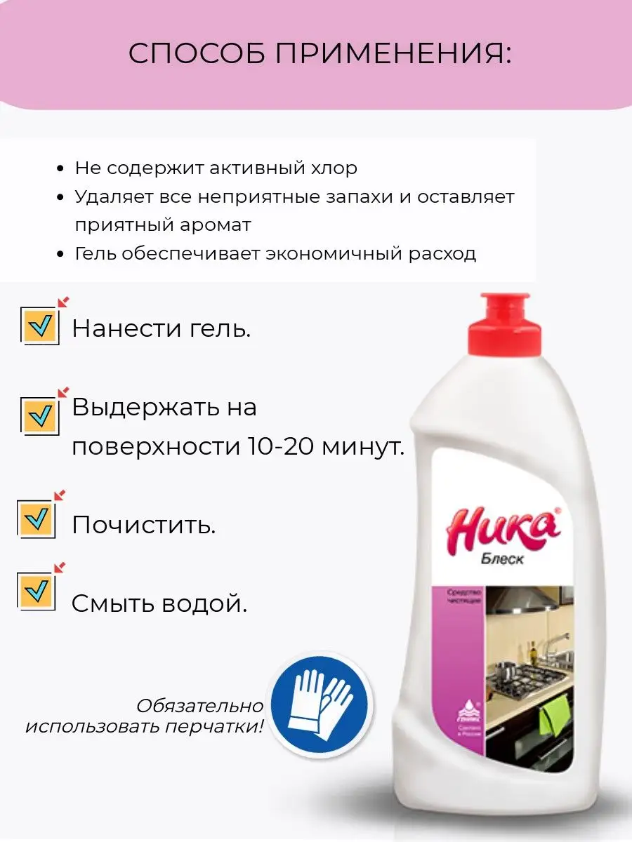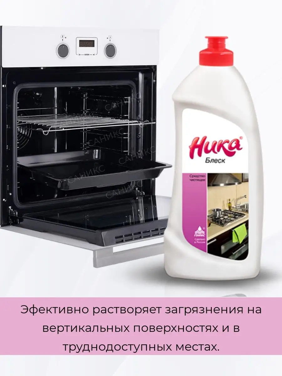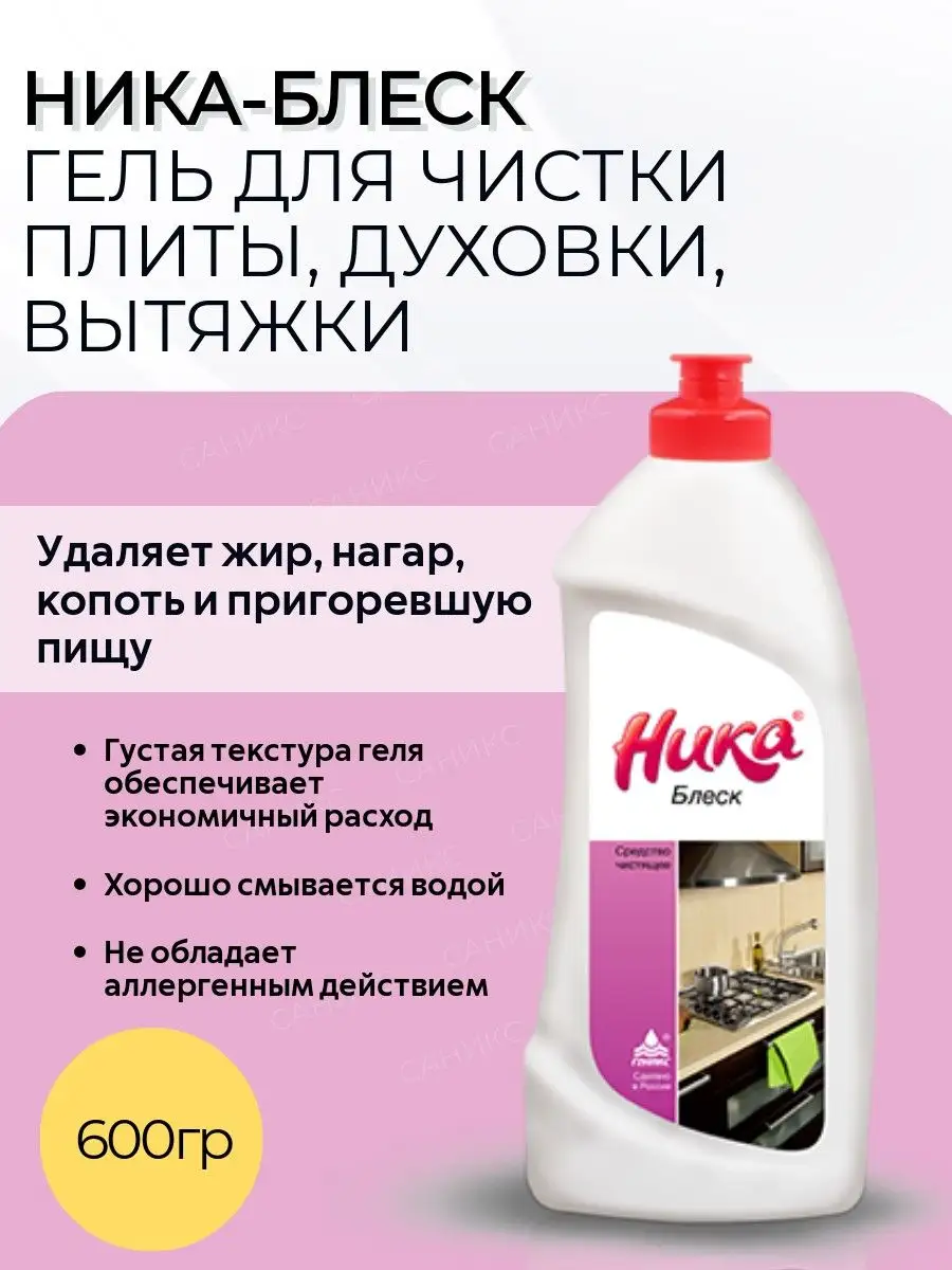 Описание: Ника Блеск - Удаляет жир, нагар, копоть и пригоревшую пищу.- Растворяет загрязнения на вертикальных поверхностях и в труднодоступных местах.- Удаляет все неприятные запахи и придает приятный аромат.- Хорошо смывается водой.- Не обладает аллергенным действием.- Свободно от хлора.- Гель обеспечивает экономичный расход.- После замерзания сохраняет все чистящие свойства. - ПРИМЕНЕНИЕ НИКА БЛЕСК - Нанести гель.- Выдержать на поверхности 10-20 минут.- Почистить.- Смыть водой.### Состав:- Щелочь более 5%.- АПАВ менее 5%.- Активные добавки.- Ароматизатор.