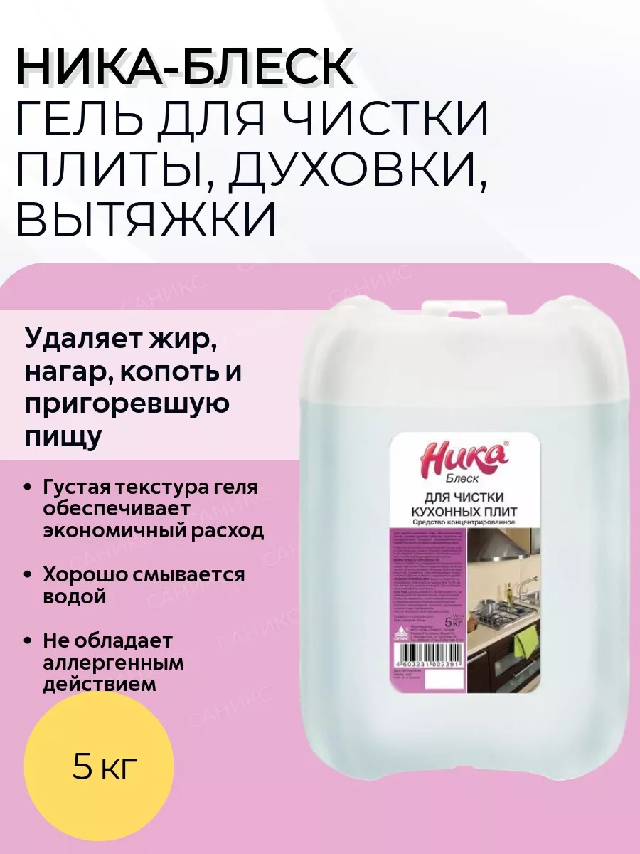 Описание: Ника Блеск - Удаляет жир, нагар, копоть и пригоревшую пищу.- Растворяет загрязнения на вертикальных поверхностях и в труднодоступных местах.- Удаляет все неприятные запахи и придает приятный аромат.- Хорошо смывается водой.- Не обладает аллергенным действием.- Свободно от хлора.- Гель обеспечивает экономичный расход.- После замерзания сохраняет все чистящие свойства. - ПРИМЕНЕНИЕ НИКА БЛЕСК - Нанести гель.- Выдержать на поверхности 10-20 минут.- Почистить.- Смыть водой.### Состав:- Щелочь более 5%.- АПАВ менее 5%.- Активные добавки.- Ароматизатор.