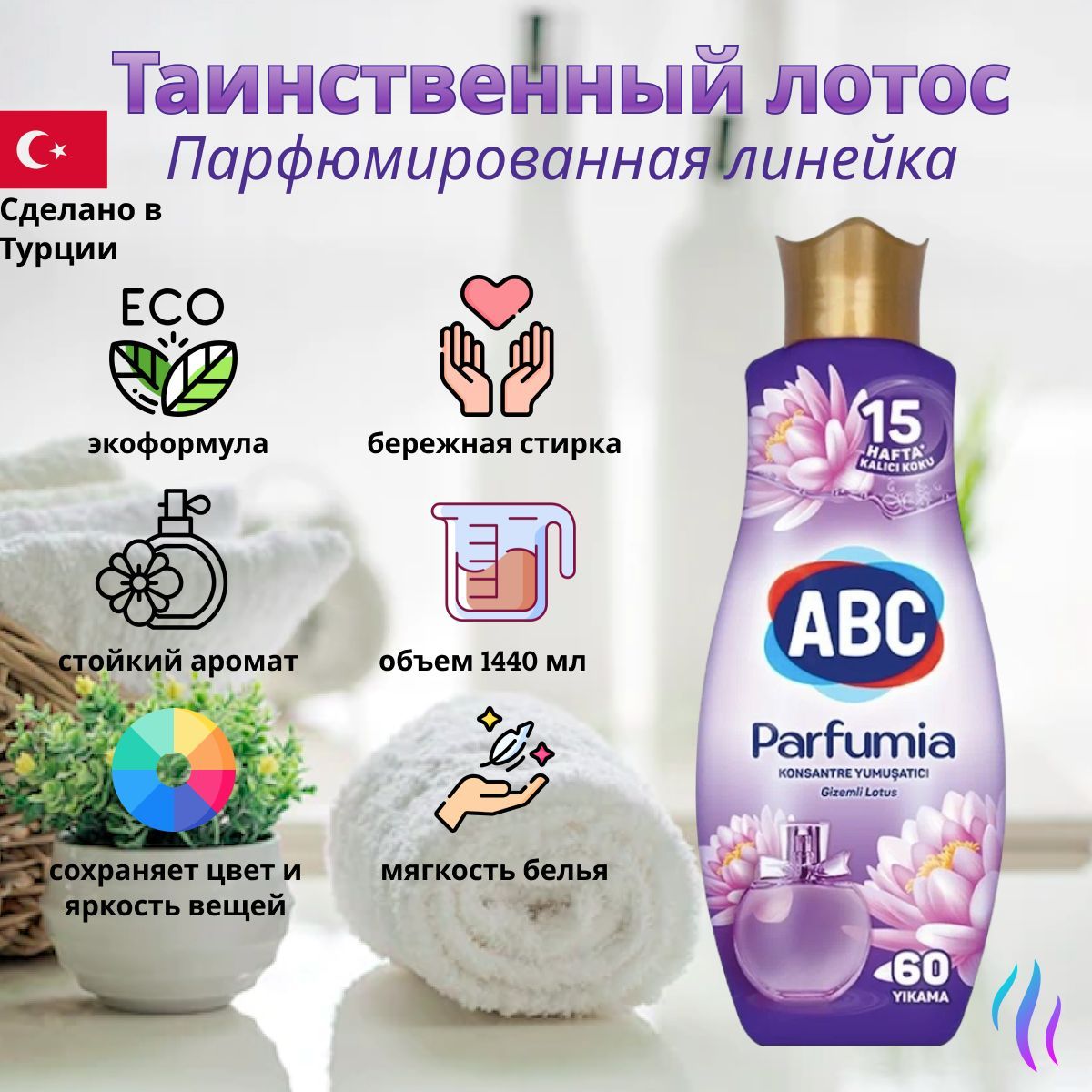 Концентрированный кондиционер для белья АВС Таинственный Лотос, 1440 мл./ Смягчитель для стирки белья / АБЦ Турция