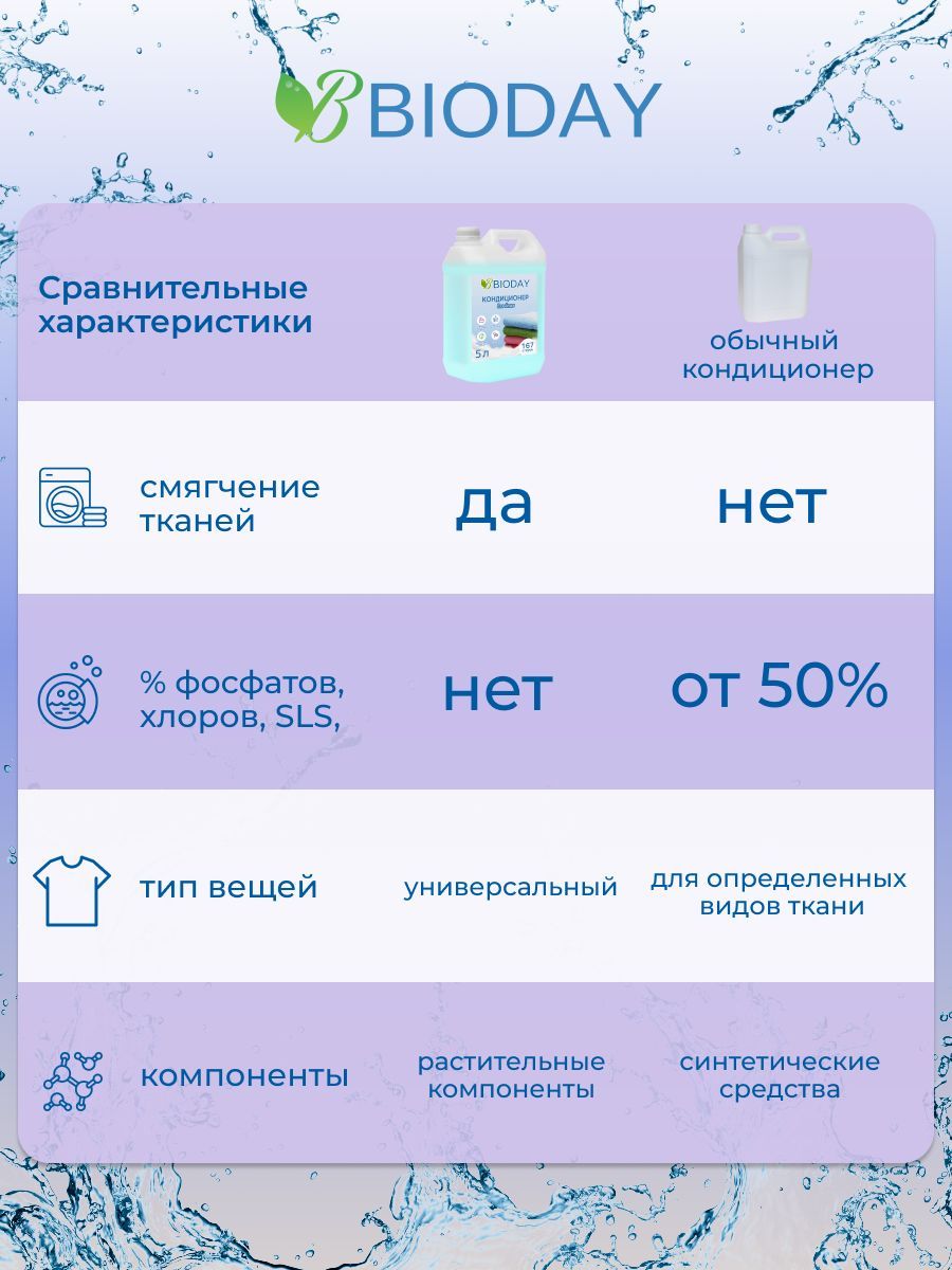 Описание: Кондиционер для белья для всех видов ткани BIODAYКондиционер для белья всех видов ткани BIODAY с добавлением натурального мягчителя и экстракта хлопка придаст Вашим вещам мягкость и свежесть, а так же снимет антистатический эффект.Кондиционер для белья для всех видов ткани BIODAY▪️ Облегчает глаженье