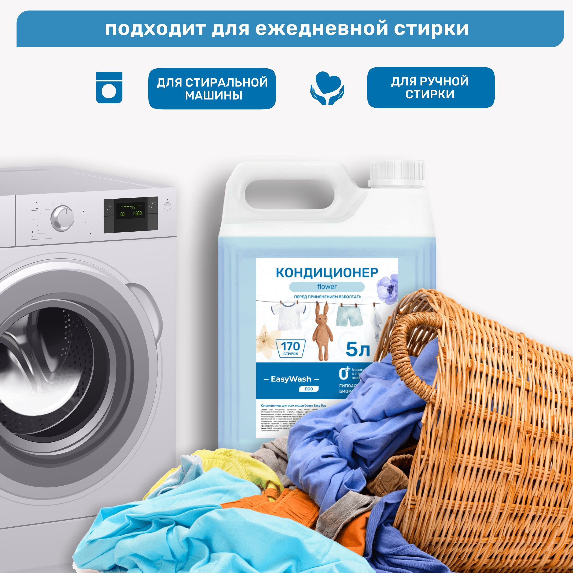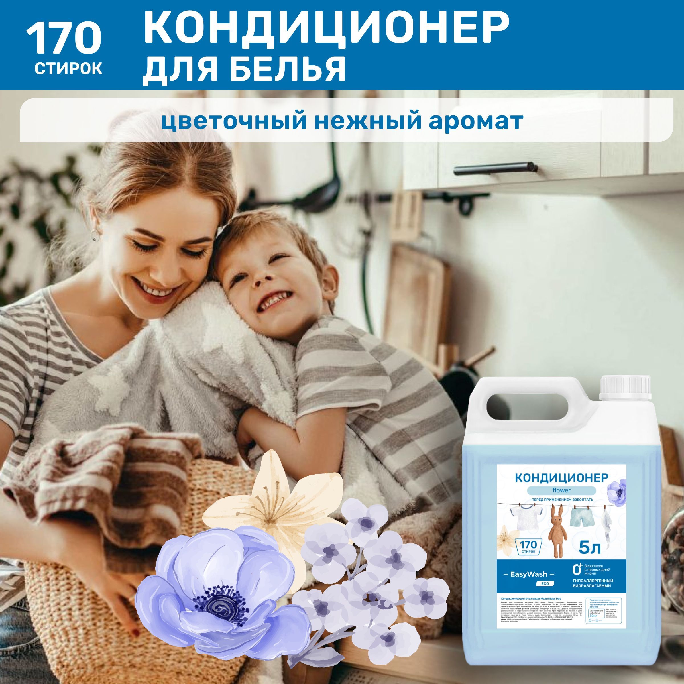 Кондиционер для белья 5л цветочный универсальный / Ополаскиватель для стирки детский, для цветного, белого и черного вида одежды