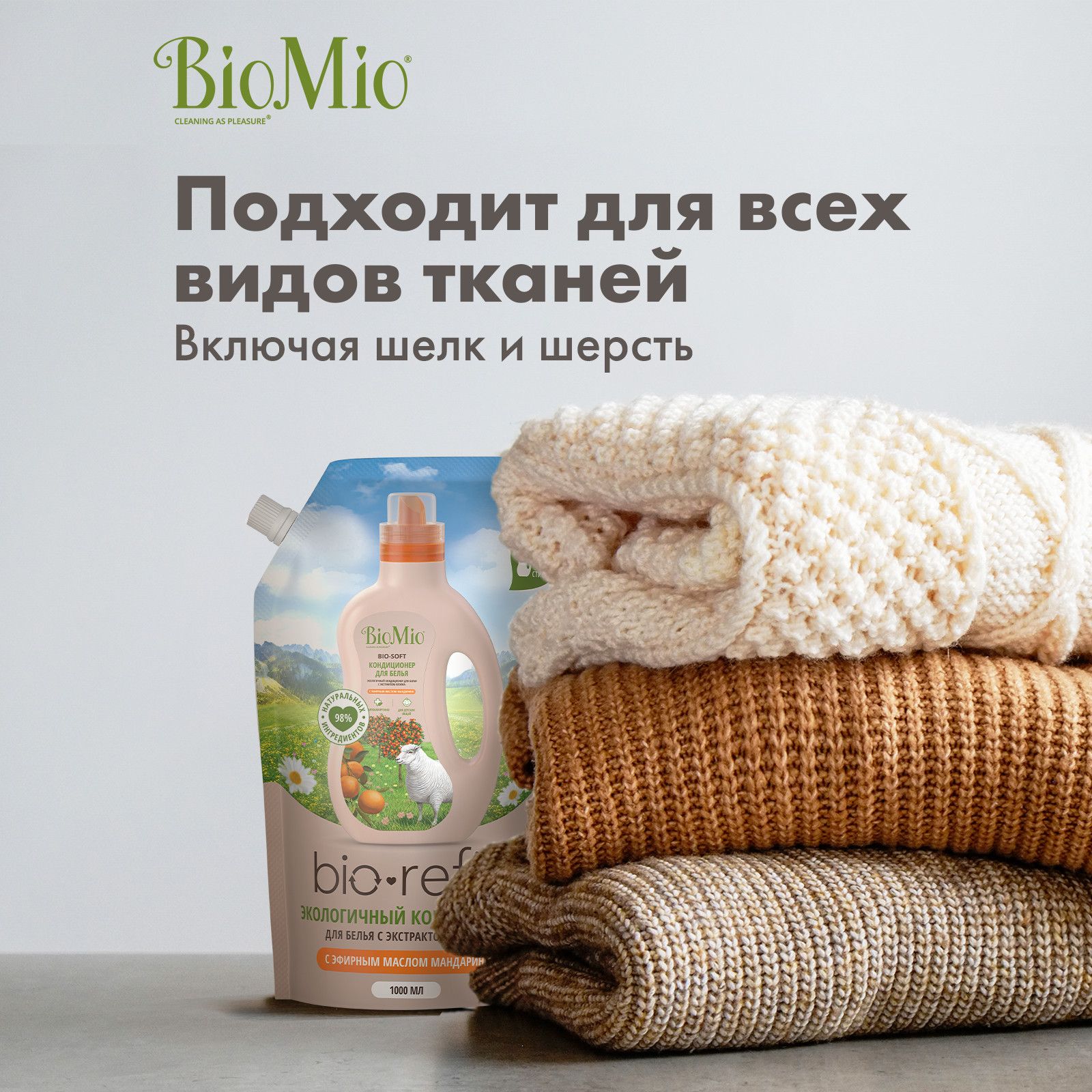 Кондиционер для белья BioMio Bio-Soft с эфирным маслом мандарина, экологичный, концентрат, сменный блок, 1000 мл.