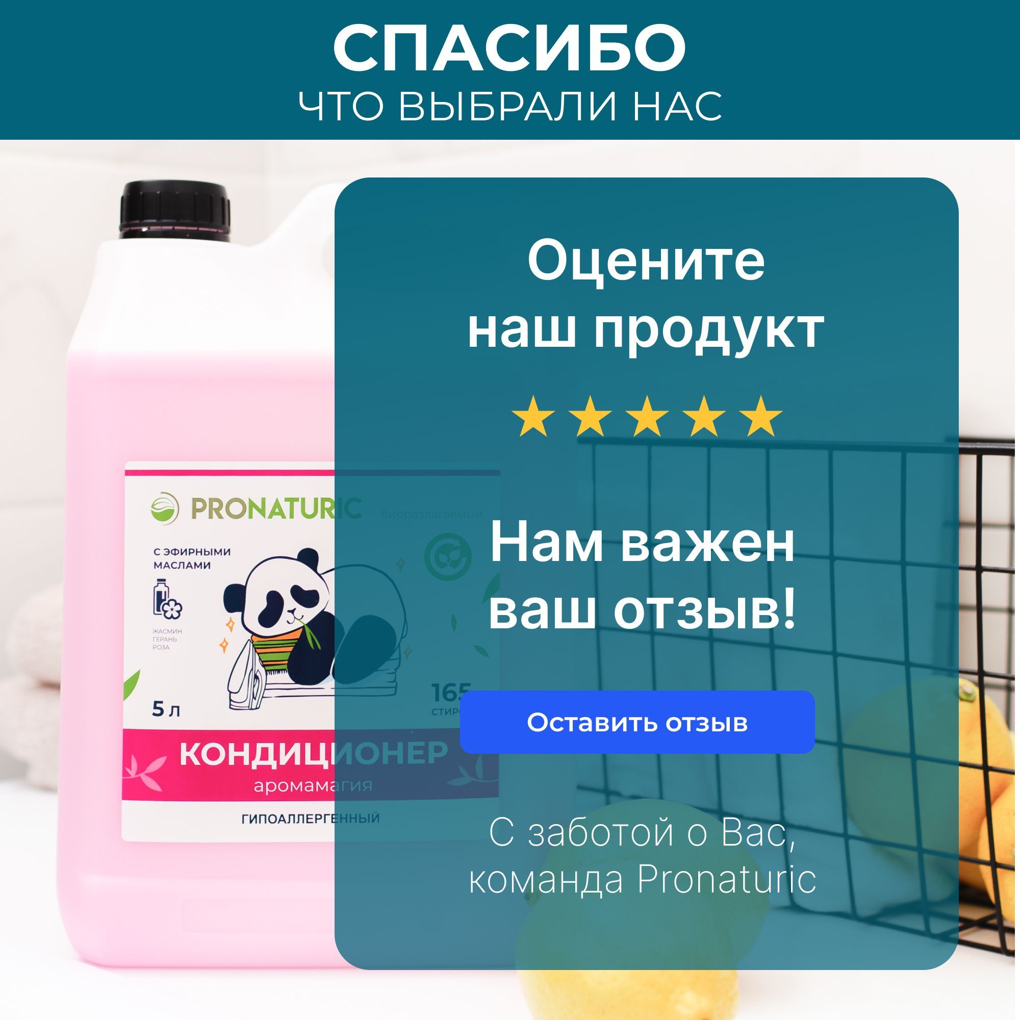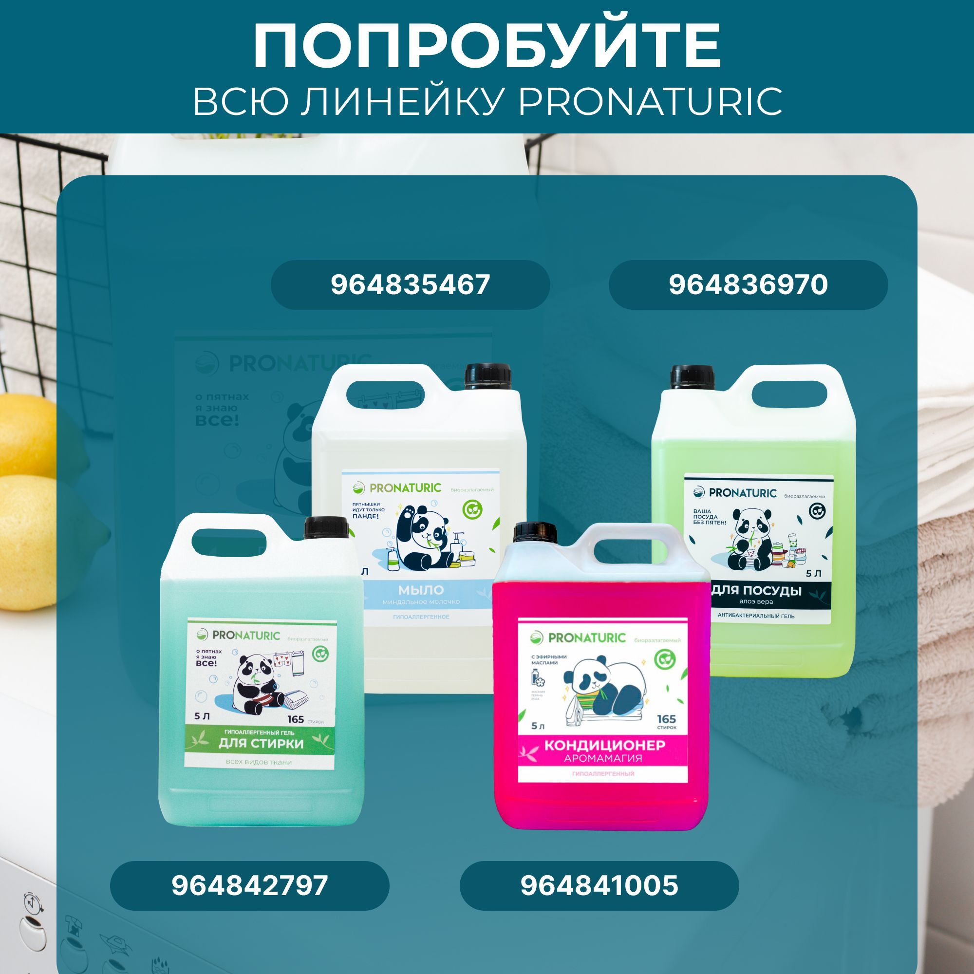 Описание: Серия кондиционеров от PronaturicКондиционер-ополаскиватель для белья от бренда Pronaturic 5 ЛИТРОВ "АРОМА МАГИЯ". Эффективное средство для бережного ухода за всеми типами тканей. Кондиционер можно использовать в стиральных машинах различного типа, а также при полоскании после ручной стирки белья. Кондиционер для белья облегчает глажку изделий из плотных тканей, таких как шторы, покрывала, постельное белье.Средство для ополаскивания освежает ткани, придавая им легкий и нежный аромат. Бережный уход за одеждой включает в себя не только стирку, но и использование кондиционера, который обладает смягчающим и антистатическим эффектом, предотвращает появление катышков. Гель ополаскиватель подходит для деликатных тканей и детских вещей. Гипоаллергенный бальзам защищает кожу рук от раздражения и безопасен для детей и взрослых. Парфюм для белья содержит эфирные масла жасмина, герани и розы, которые создают незабываемый легкий и приятный аромат свежести и чистоты. Кондиционер ополаскиватель полностью вымывается из волокон ткани и не оставляет на одежде никаких следов кроме тонкого цветочного аромата. Более того, бальзам для белья безопасен для септических установок, поэтому его можно использовать в частном доме с автономной канализацией. Способ применения: при стирке добавить 30 мл на ПЯТЬ килограммов белья. Условия хранения: хранить при температуре не выше 45 градусов Цельсия, под воздействием солнечных лучей возможно изменение цвета, средство замерзает, после размораживания и перемешивания сохраняет свои свойства.Условия хранения: хранить при температуре не выше 45 градусов Цельсия, под воздействием солнечных лучей возможно изменение цвета, средство замерзает, после размораживания и перемешивания сохраняет свои свойства. Попробуйте новый биоразлагаемый кондиционер-ополаскиватель для белья. Ознакомиться со всей линейкой моющих и чистящих средств от бренда Pronaturic можно перейдя по ссылке нашего магазина.