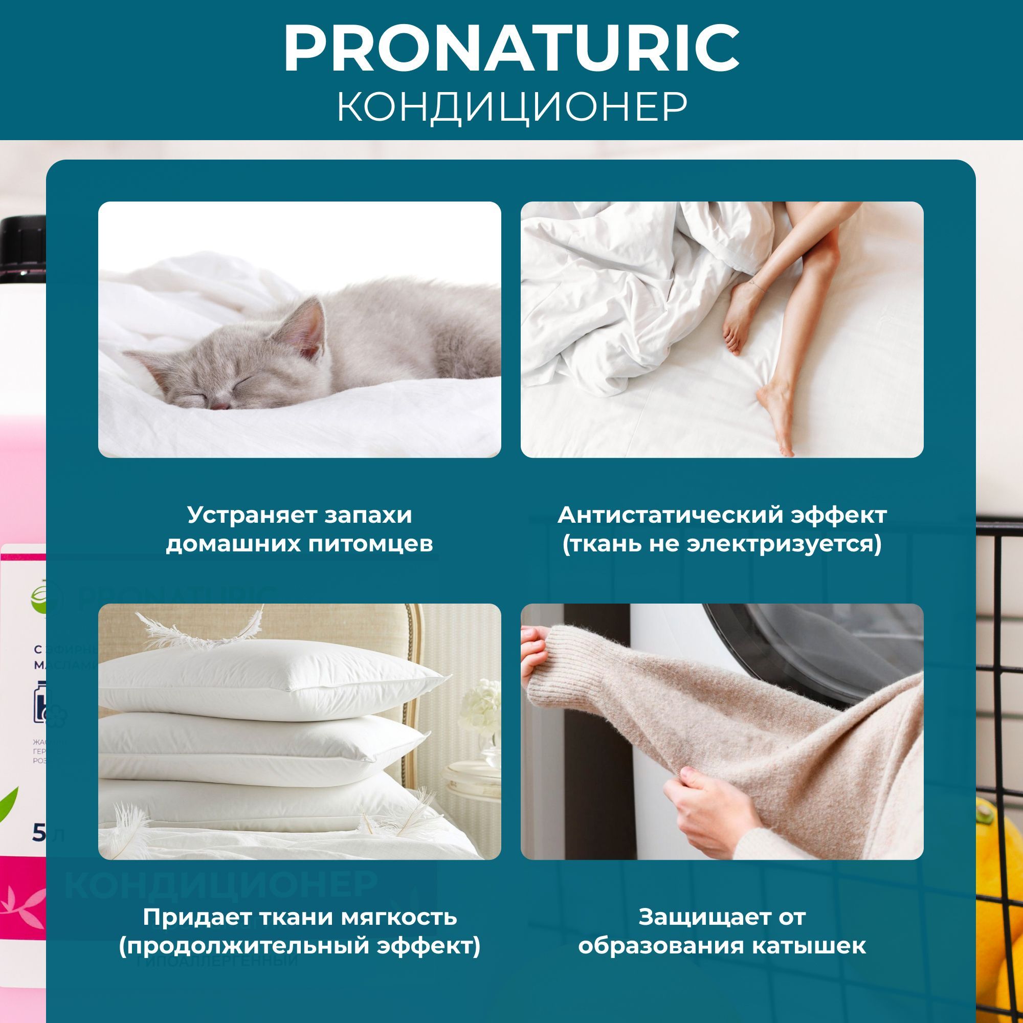 Особенности применения: Антистатический эффект, Не требует смывания водой, Эффективен в холодной воде, Гипоаллергенность, Антибактериальный эффект, Экосредство, Ароматизация, Концентрат, Увлажняющая формула