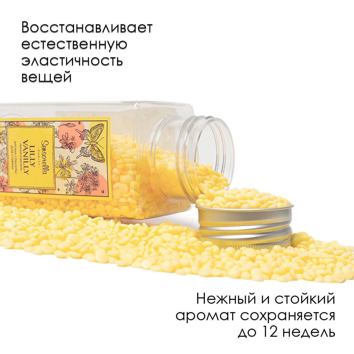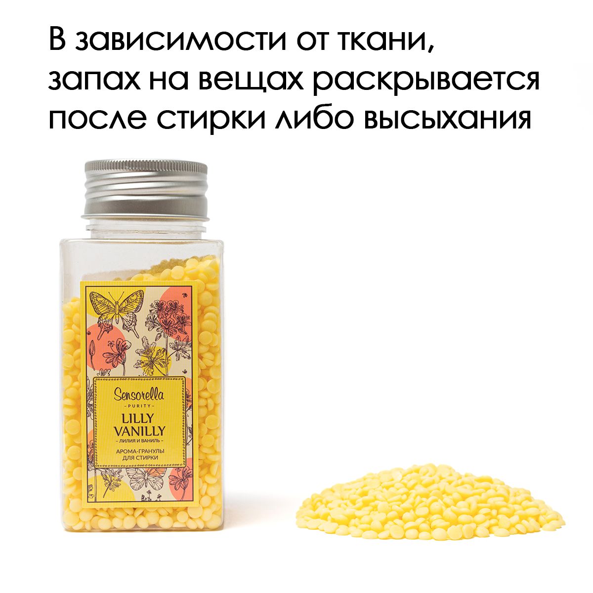 *Важно заметить, что аромат гранул раскрывается на вещах постепенно. Если сразу после стирки вы не заметили аромата - ничего страшного! Просто повесьте белье сушиться и через некоторое время аромат появится*
