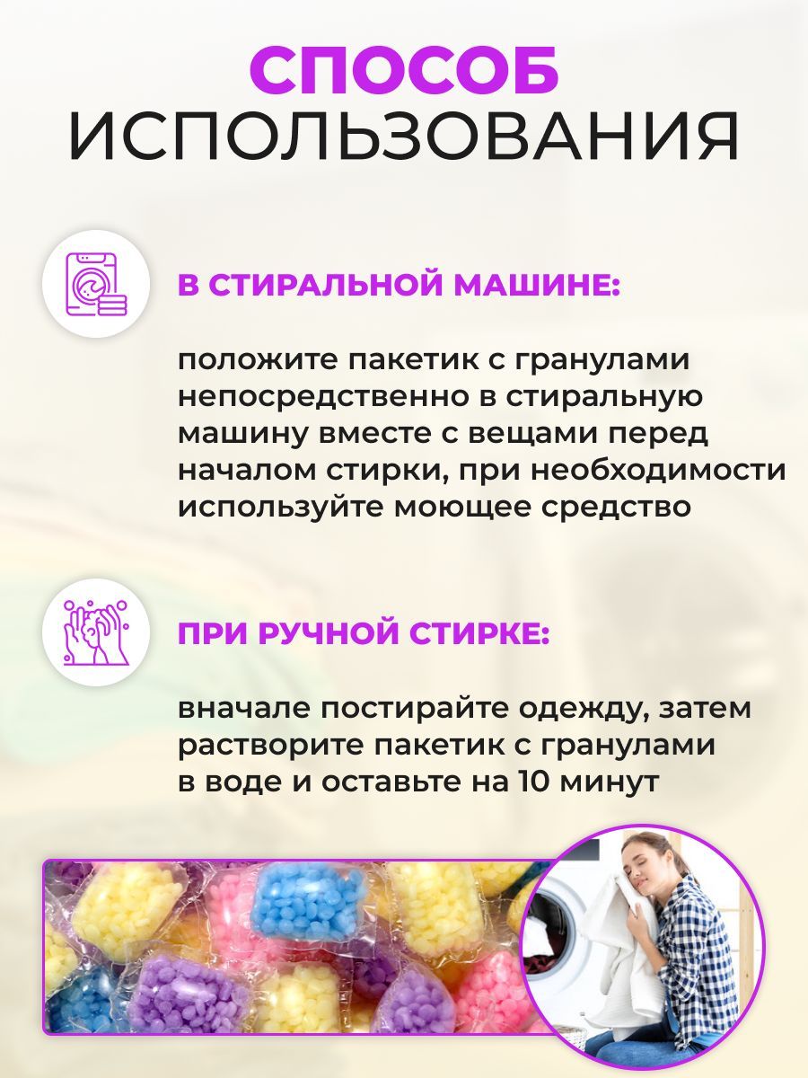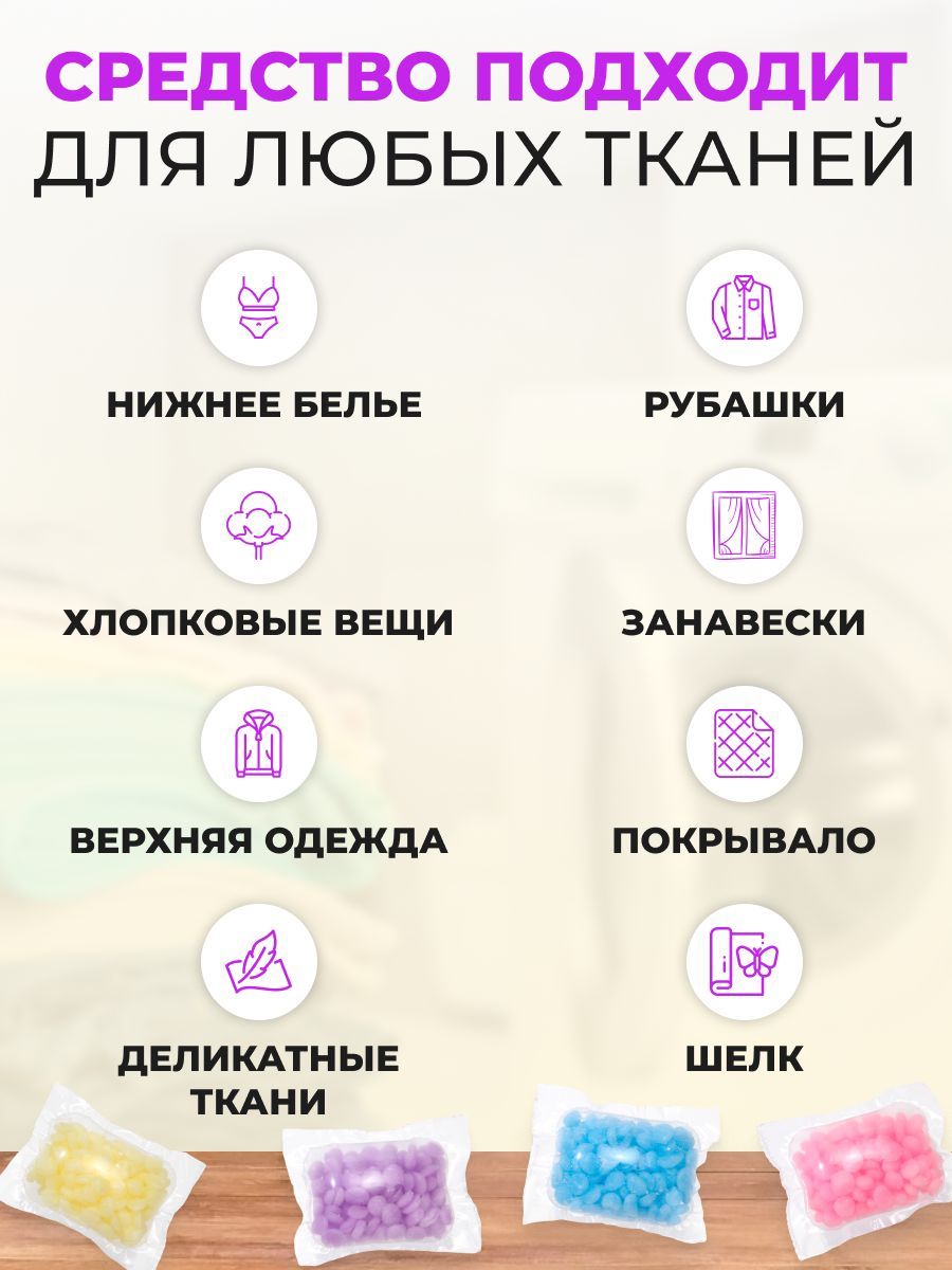 Придает вашим вещам неповторимую свежесть, легкий, изысканный и ненавязчивый аромат. Применяется при стирке любых вещей. В упаковке находится 100 капсул разных ароматов: лаванда, роза, морская свежесть, фрукты.