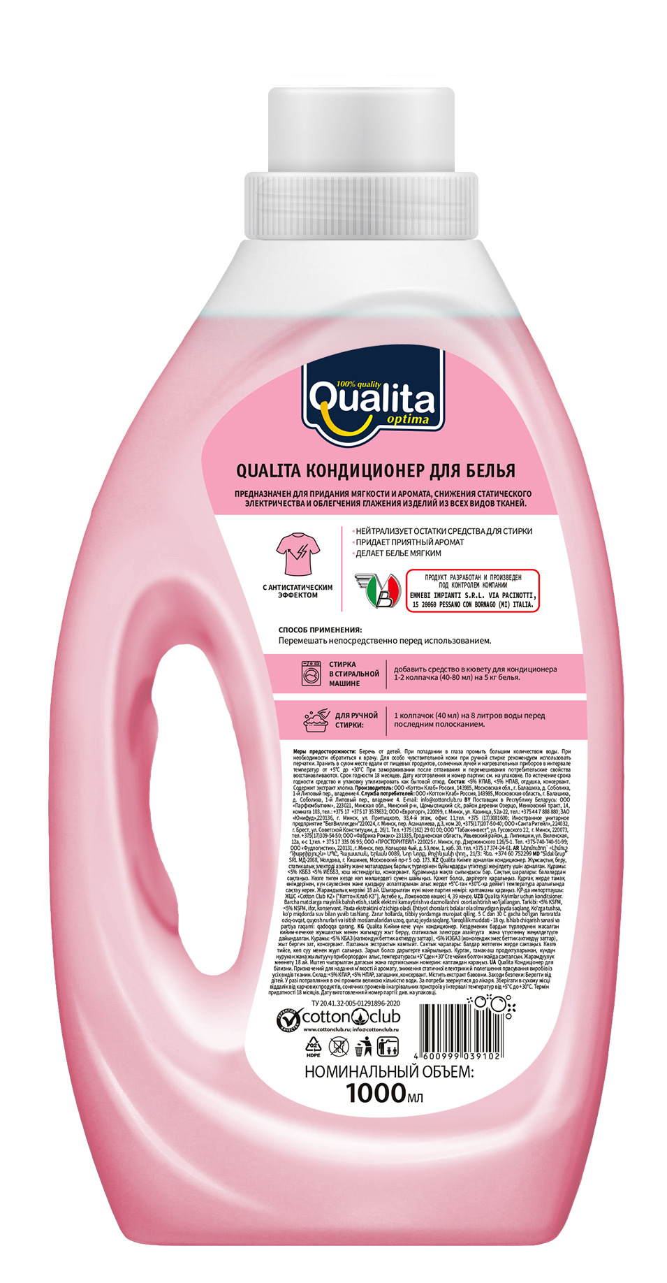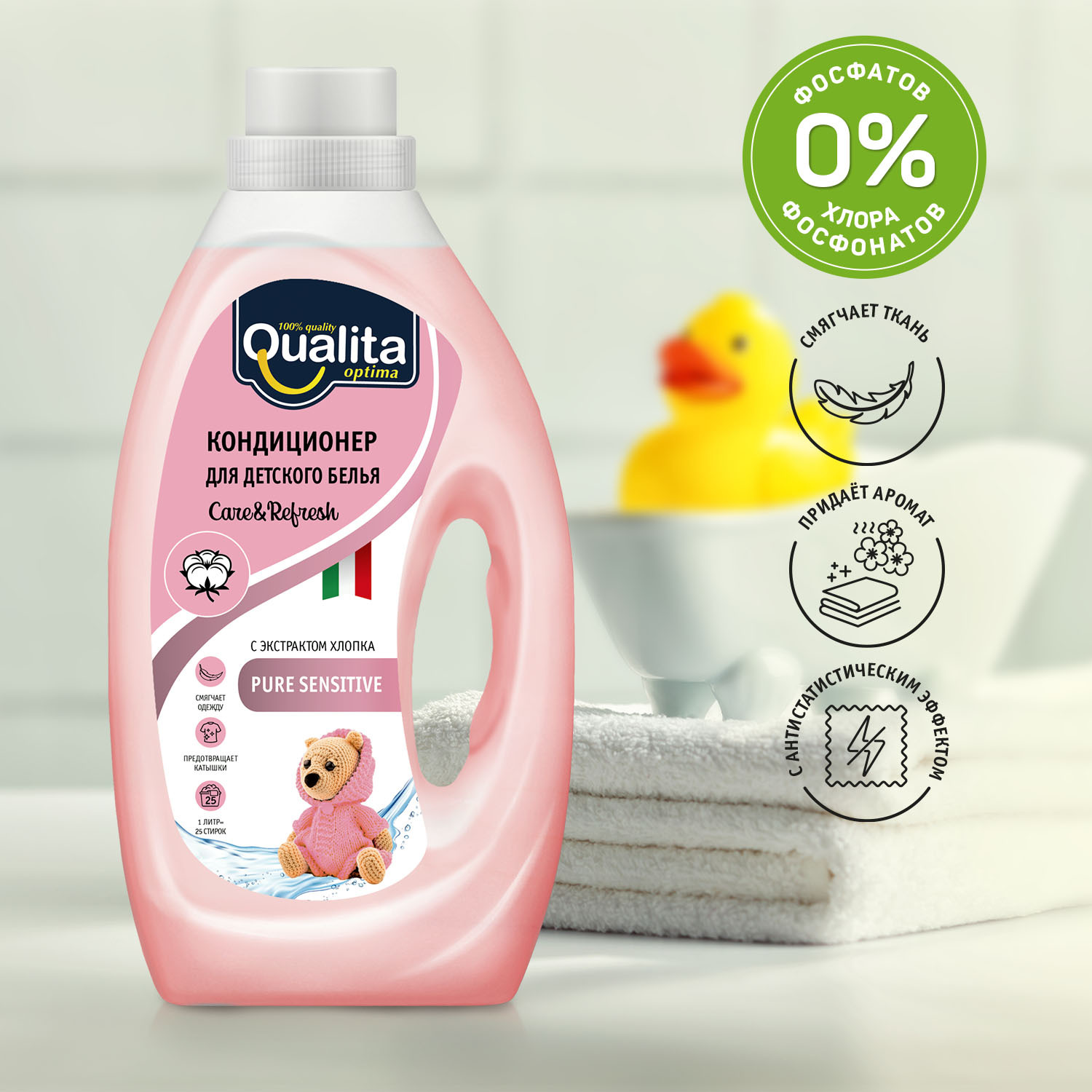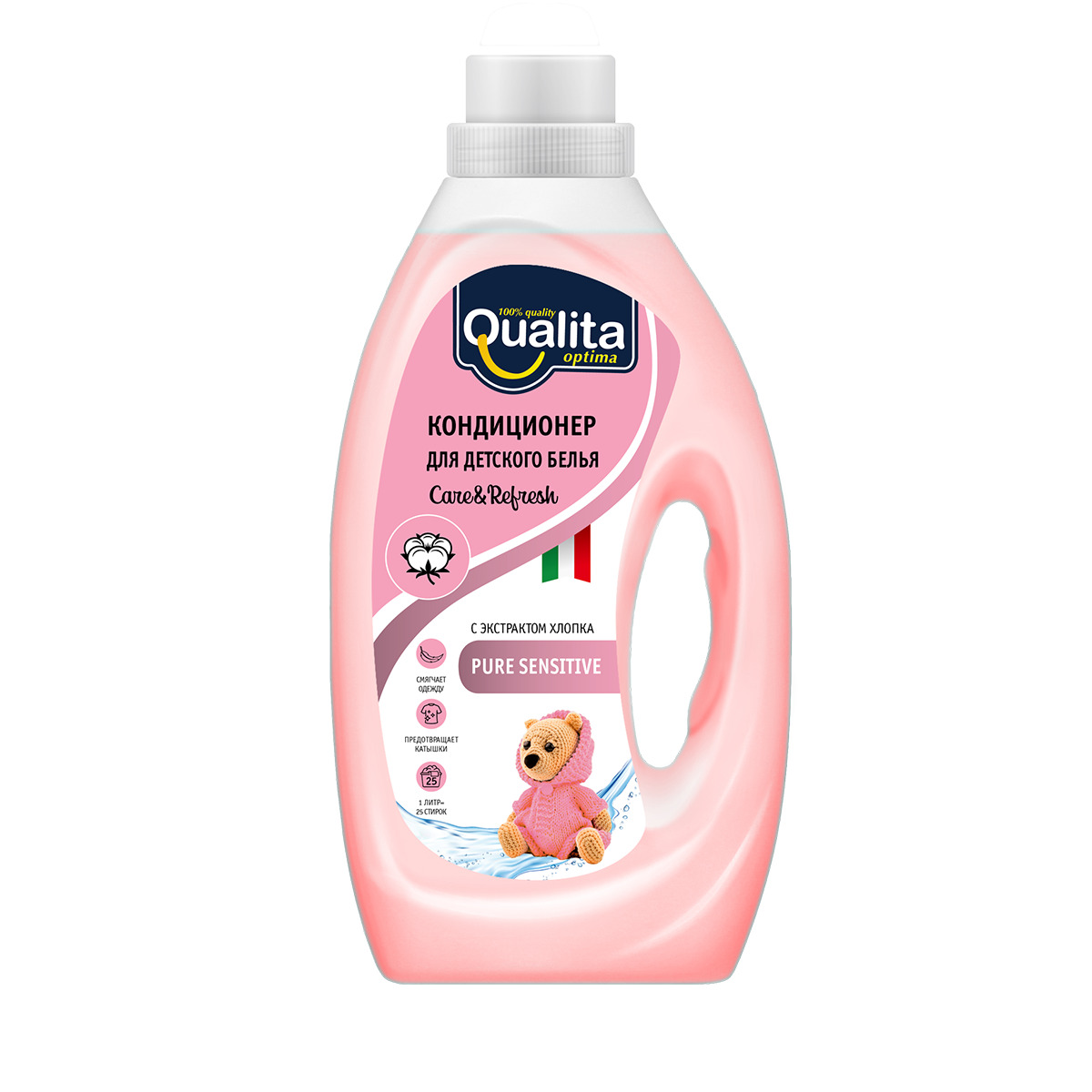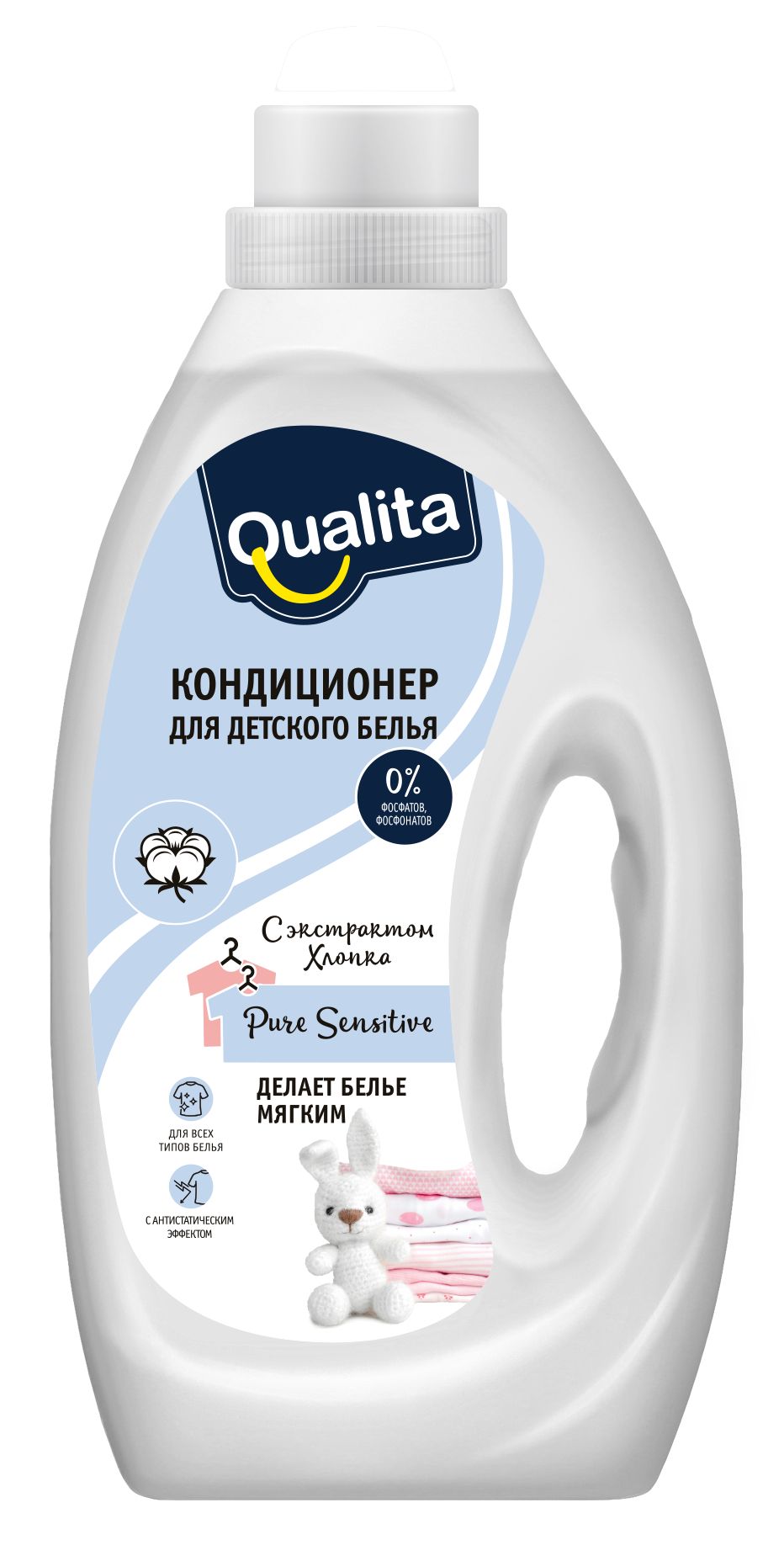 Кондиционер для ДЕТСКОГО белья QUALITA PURE SENSITIVE, БЕЗ ОТДУШКИ, с антистатическим эффектом, с экстрактом хлопка, флакон, 1л