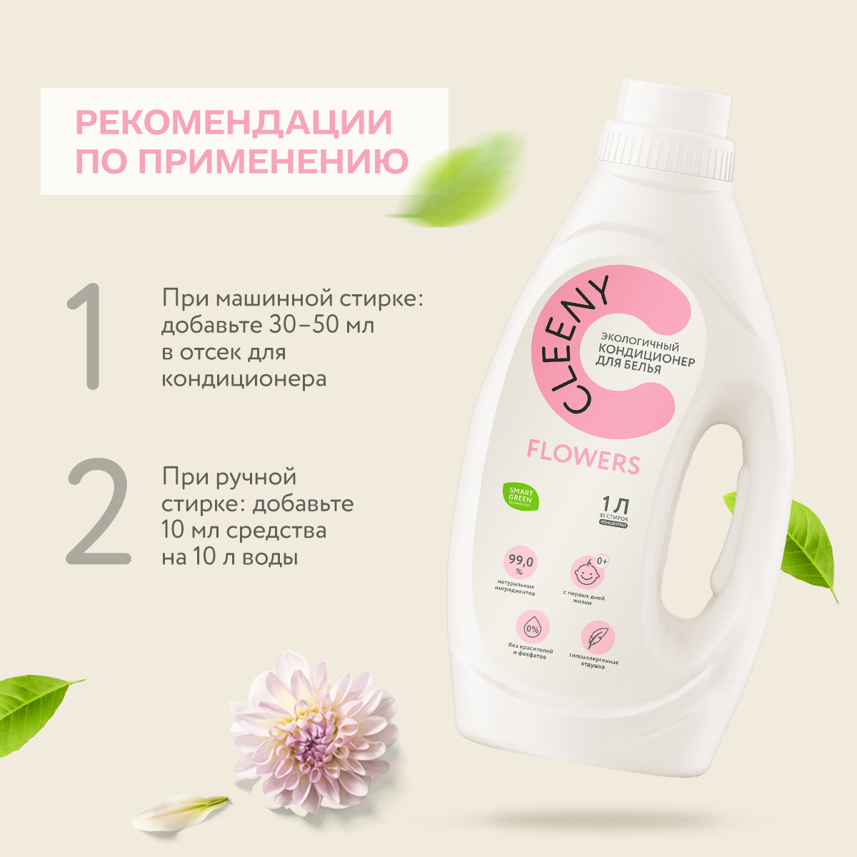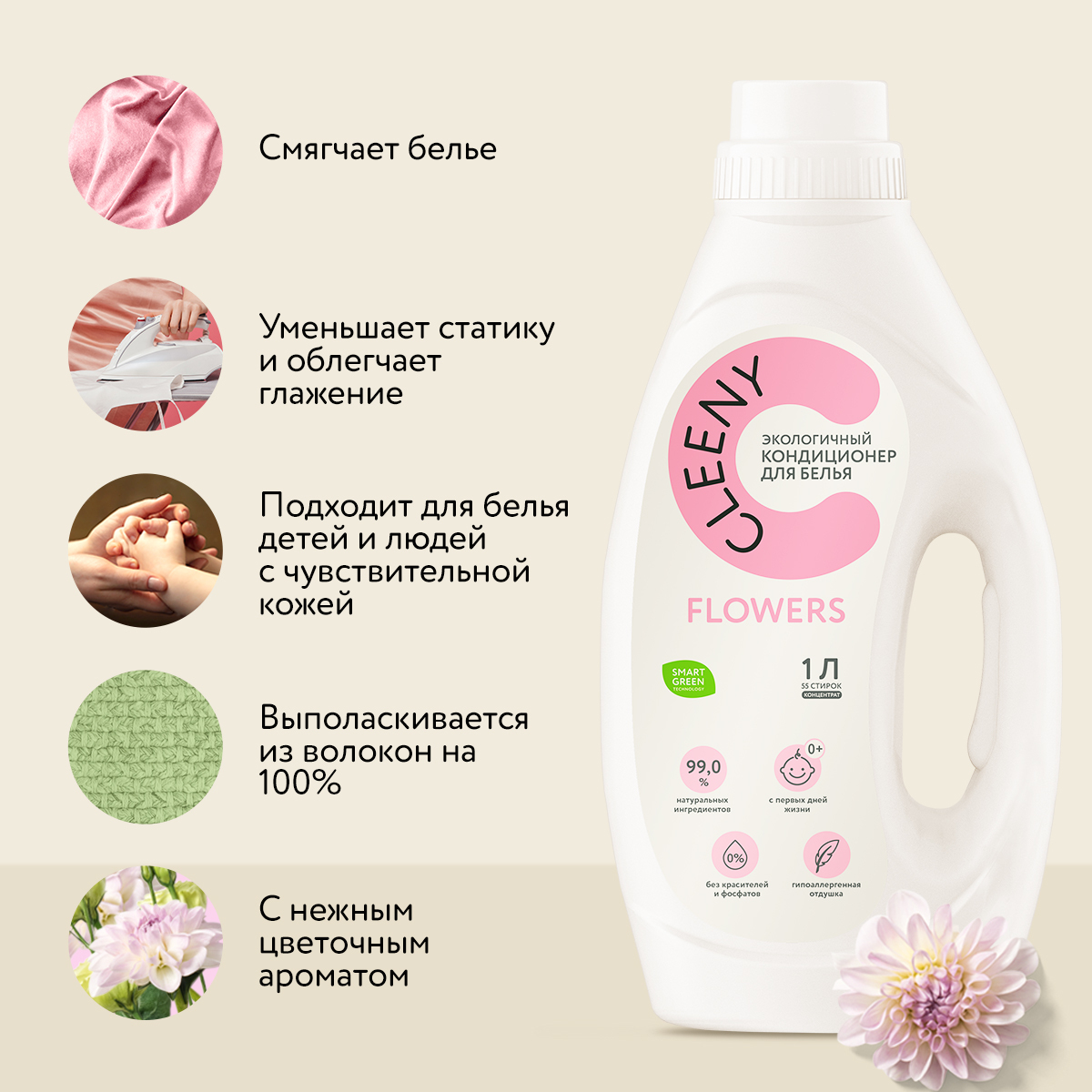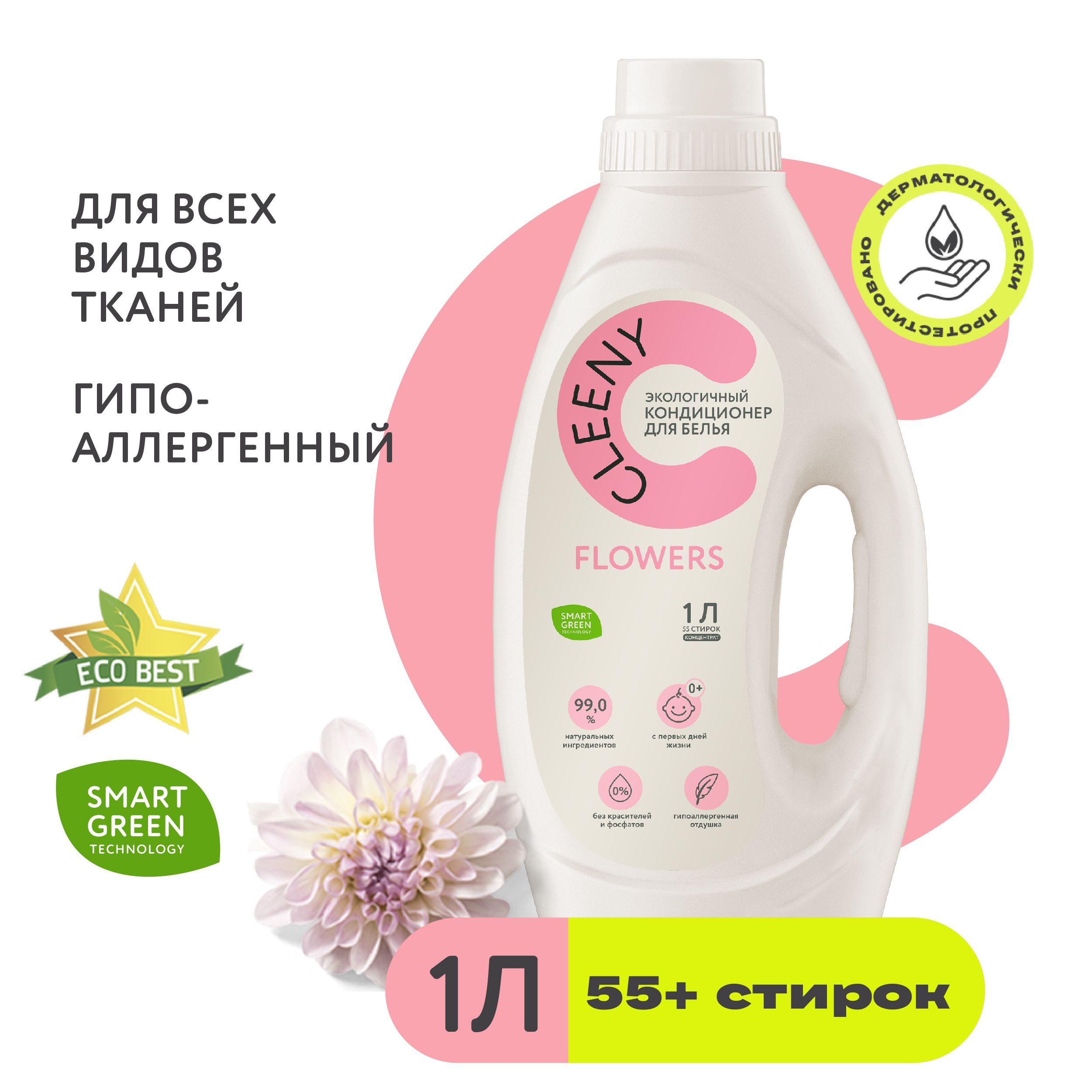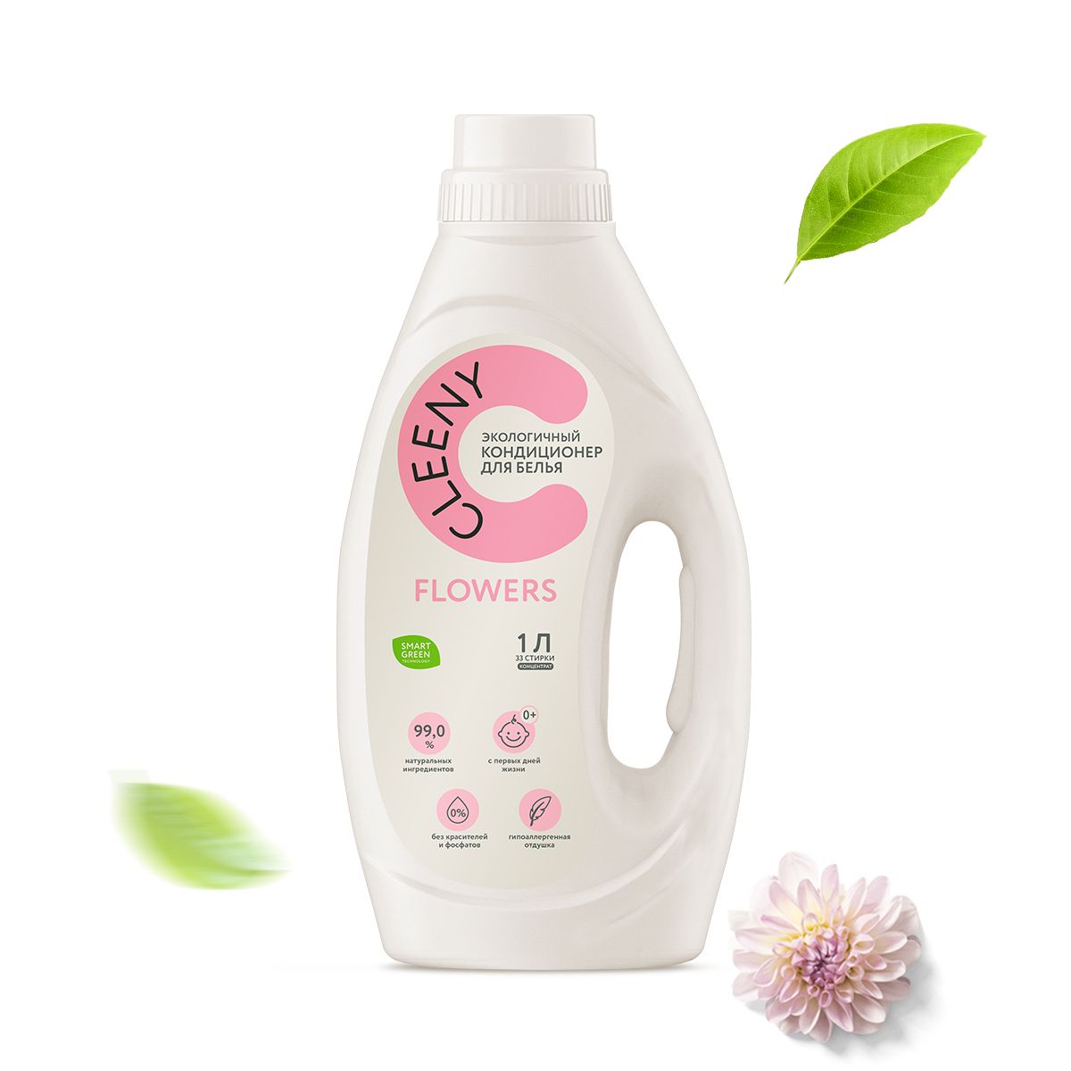 Кондиционер для взрослого и детского белья Cleeny 1л, экологичный биоразлагаемый ополаскиватель, гипоаллергенный, с ароматом цветов