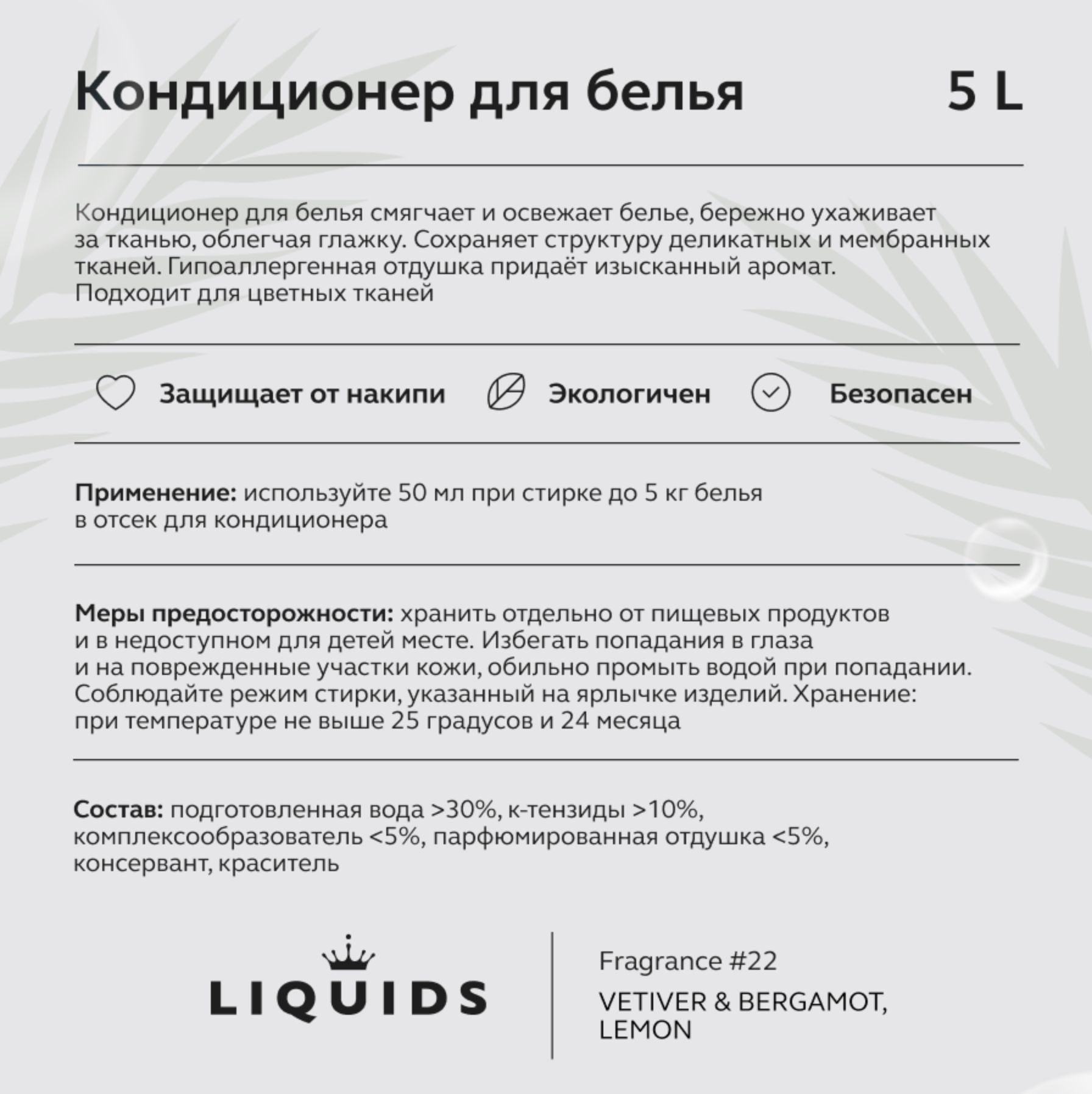 Описание: Гипоаллергенный кондиционер ополаскиватель для стирки белья 5 литров LIQUIDS со свежим и бодрящим ароматом Ветиве, Бергамот и Лимон. Смягчает и освежает белье, бережно ухаживает за тканью и значительно облегчает глажку. Идеален для нижнего белья и детской одежды.