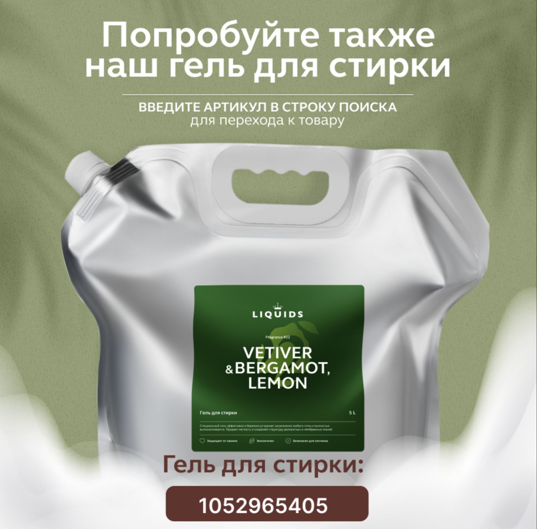 Нежный гель после стирки LIQUIDS создан с добавлением французских отдушек: ветивер, бергамот и лимон – аромат категории унисекс. Подарите белью аромат роскоши. Яркий сочный лимон, нежный и свежий бергамот - получается цитрусовый летний коктейль с горчинкой, который в конце приправлен зелёной нотой ветивера, смягчающий послевкусие аромата. После применения ополаскивателя на белье остается нежный аромат.