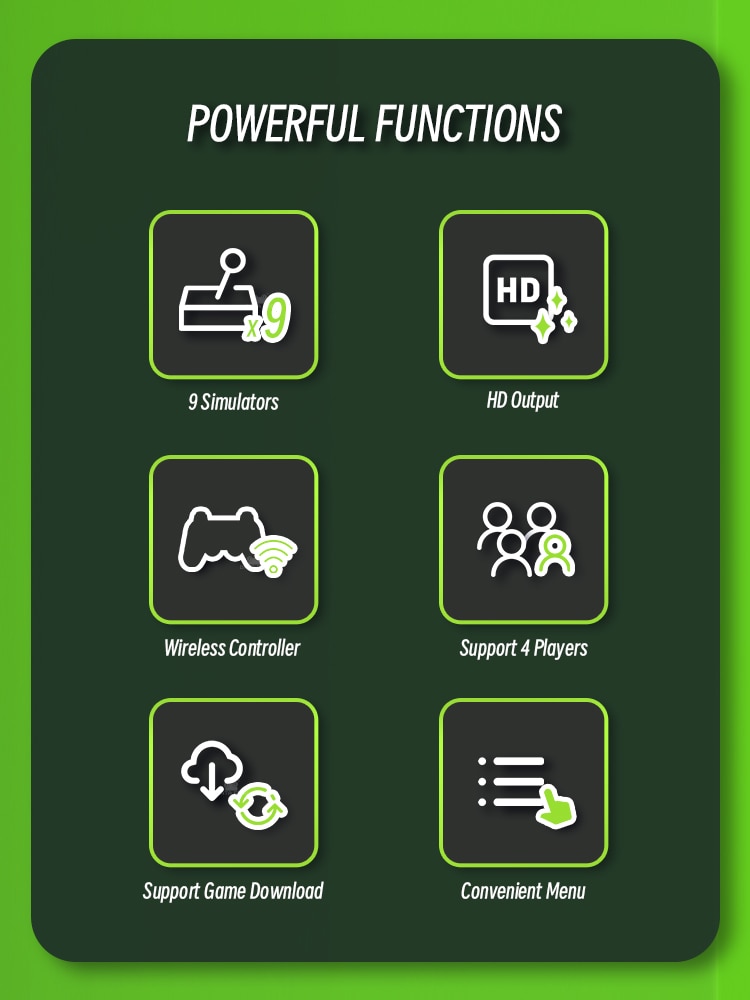 Установлена Беспроводная игровая приставка для телевизора с более чем 10000 видами богатых игр, установлено 9 эмуляторов, поддерживающих несколько игр, и прикреплена TF-карта на 32 ГБ. Используйте обновленные игровые чипы для поддержки 8-битных, 16-битных, 32-битных, 64-битных, 128-битных и других эмуляторов. Он идеально отвечает вашим потребностям в качестве изображения и беглости игры.