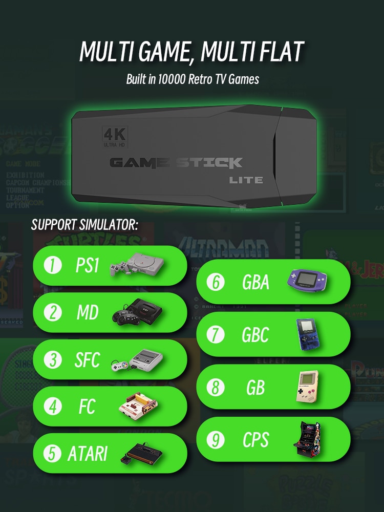 С модернизированным чипом процессора GB2 Игровая приставка 4K TV имеет встроенное более 9 эмуляторов, совместимых с MAME, PS1, GB, GBA, GBC, MD, SFC, игры формата FC и ATARI, которые вы можете скачать и сохранить на своей карте памяти;