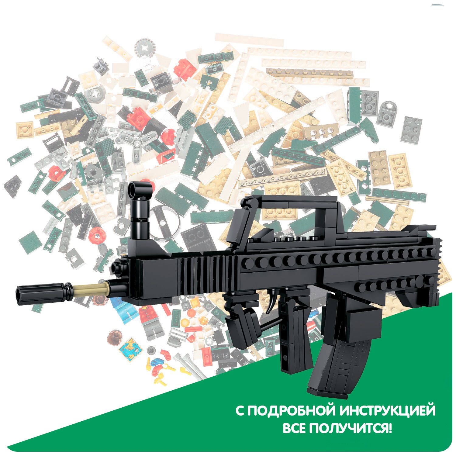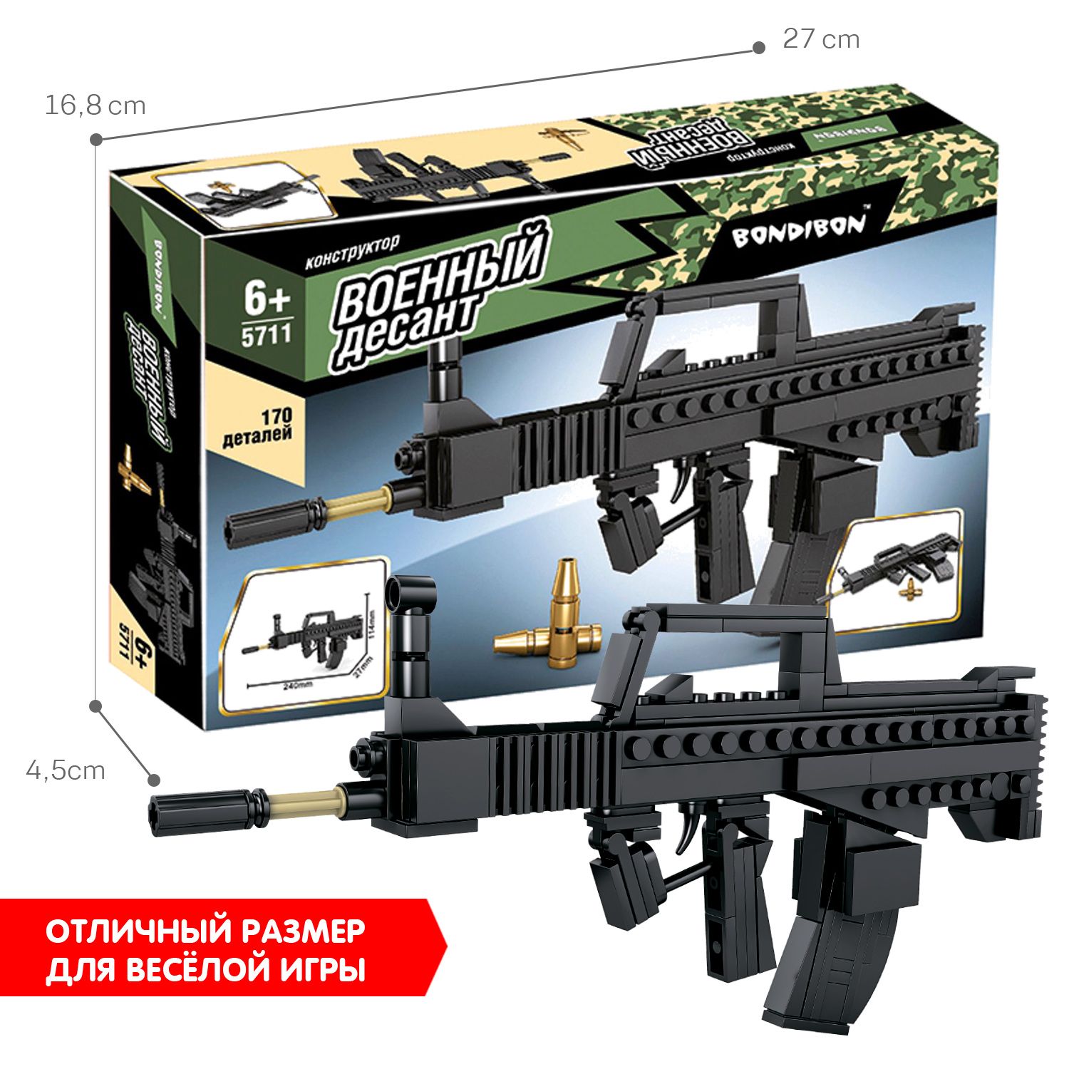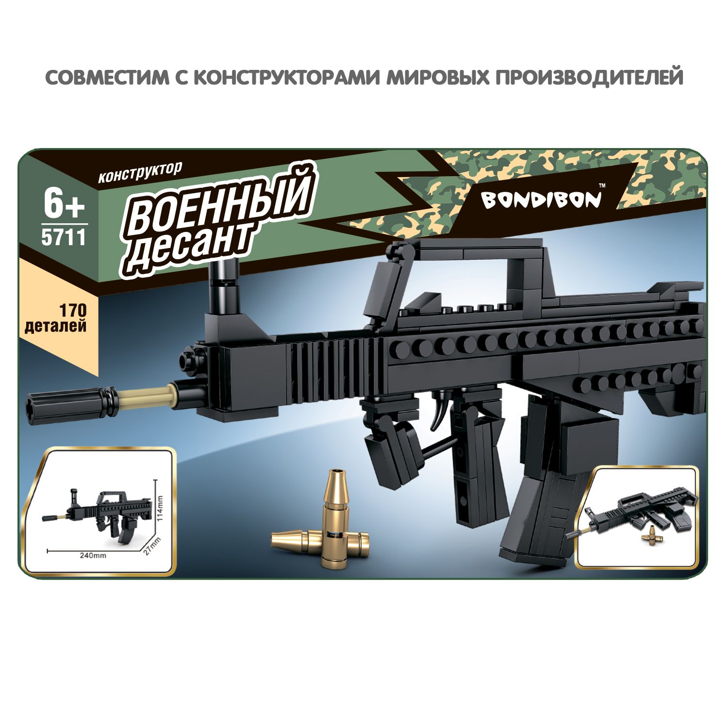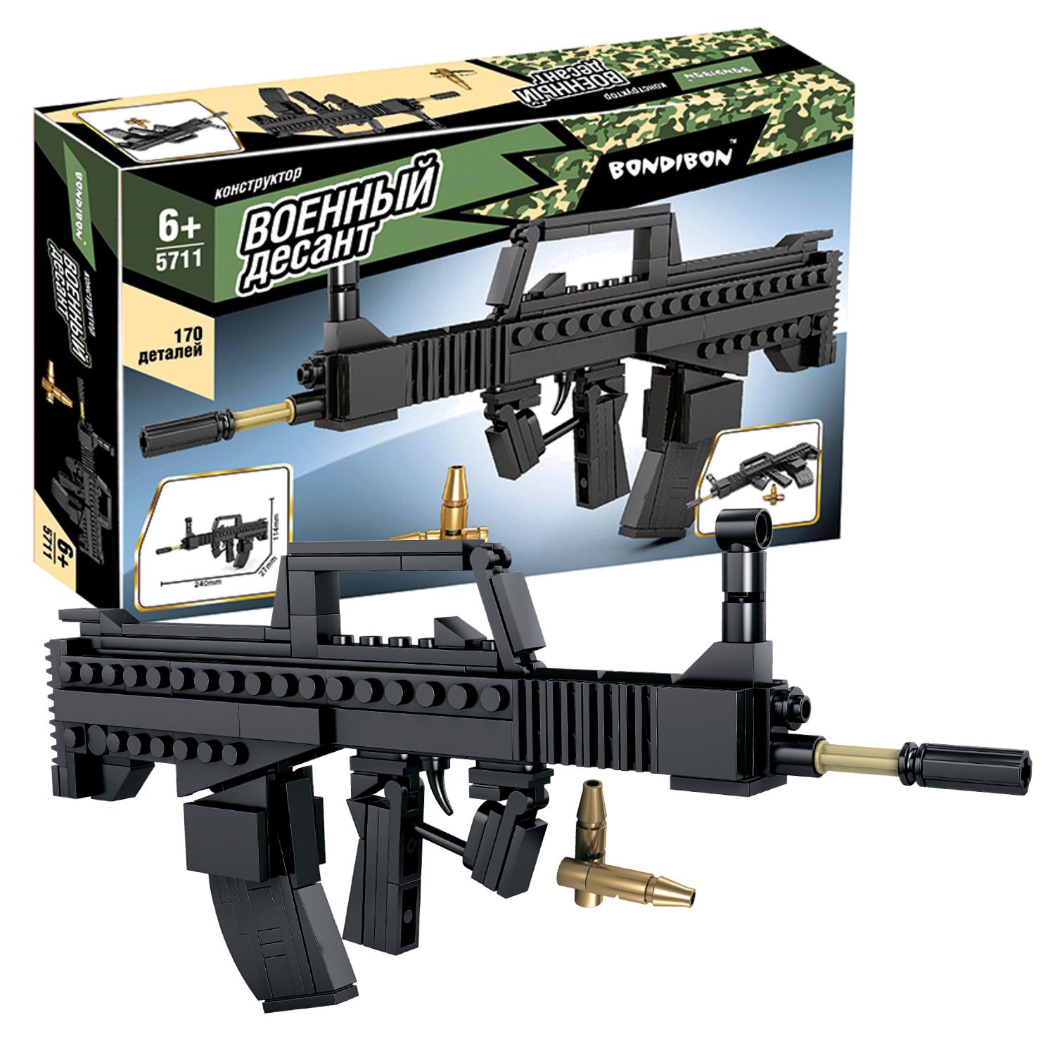 Описание: Легко ли собрать автомат? Чтобы собрать конструктор Автомат от Bondibon, надо подумать. В процессе сборки закладываются базовые знания робототехники. Игрушка тренирует мелкую моторику, развивает пространственное мышление и умение составлять из частей целое. В итоге у маленького воина получится мощное вооружение – большой игрушечный автомат от Военного Десанта. Такие сюжетно-ролевые игры способствуют развитию воображения и творческого мышления. Игры в войнушку детям нужны и, более того, — полезны. Они помогают сформировать психологию защитника, борца за правду, добро и справедливость Используя инструкцию, соберите автомат и патроны из 170 деталей. Все детали совместимы с конструкторами от мировых производителей. Конструктор для мальчиков и девочек от 6 лет – отличный подарок. Дарите яркие развивающие детские игрушки от Bondibon!