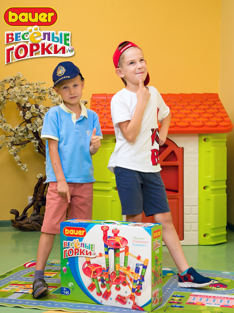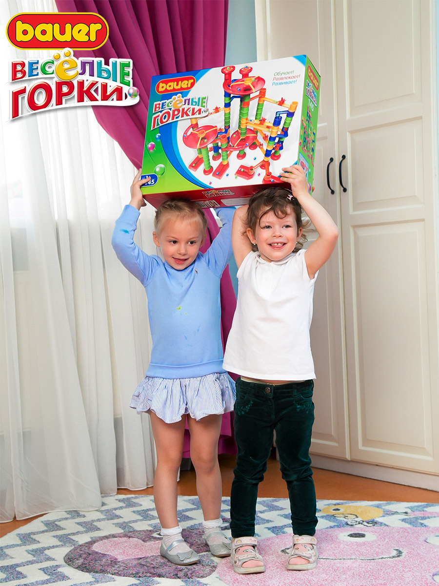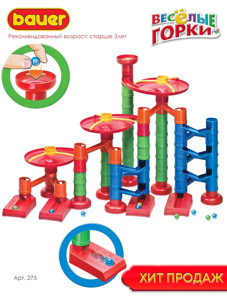 Описание: С наборами Bauer «Веселые горки» можно построить множество вариантов маршрута для скатывающегося вниз шарика, а затем наблюдать результаты своего труда, следя за тем, как шарик следует по заданной траектории. Набор «Веселые горки» — это игра, развивающая воображение и логику ребенка. Суть игры заключается в правильном построении маршрута для шарика. Некоторые варианты сборки многоуровневого маршрута указаны на упаковке. В игре могут участвовать несколько игроков одновременно, соревнуясь, чей шарик придёт к финишу первым. Конструктор прекрасно подходит для детского творчества и семейного отдыха, способствуют развитию объёмного мышления ребенка, фантазии, координации движения глаз, мелкой моторики и памяти. В состав конструктора входит 145 деталей различных форм, цветов и размеров. Игрушки сделаны из высококачественного пластика с использованием пищевых красителей. В набор входит: 3 воронки, 4 ворот, 14 больших желобов, 4 сдвоенных желоба, 18 маленьких желобов, 10 чаш, 3 держателя опоры над воронкой, 14 колес, 15 креплений для колеса, 52 цилиндрические опоры, 8 шариков. Дизайн упаковки очень яркий и привлекательный. Упаковка, как и сами наборы, разработана совместно дизайнерами и психологами. Цветовая гамма очень хорошо подходит для детского восприятия. Все используемые упаковочные материалы экологически безопасны.
