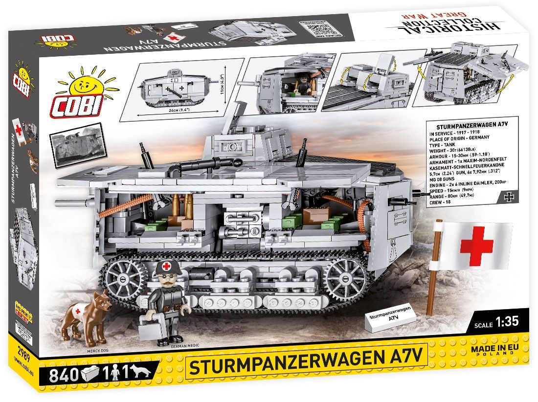 Нашумевшая модель из строительных блоков COBI точно отражает черты своего исторического прототипа. Тщательно спроектированный в масштабе 1:35, он прекрасно дополняет коллекцию GREAT WAR, в которую также входят другие транспортные средства и фигурки того периода. Klockowy Sturmpanzerwagen A7V имеет множество подвижных элементов, таких как колеса и гусеницы, стволы орудий и пулеметы. Наклеек в наборе нет. Здесь вы найдете только перманентные отпечатки! Под открывающимися сторонами есть нанесенный на карту интерьер, в котором мы также можем разместить фигуры.