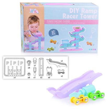 Соберите вместе с ребенком горку-автотрек с помощью прилагаемых крепежных элементов и наблюдайте за движением фигурок машин.