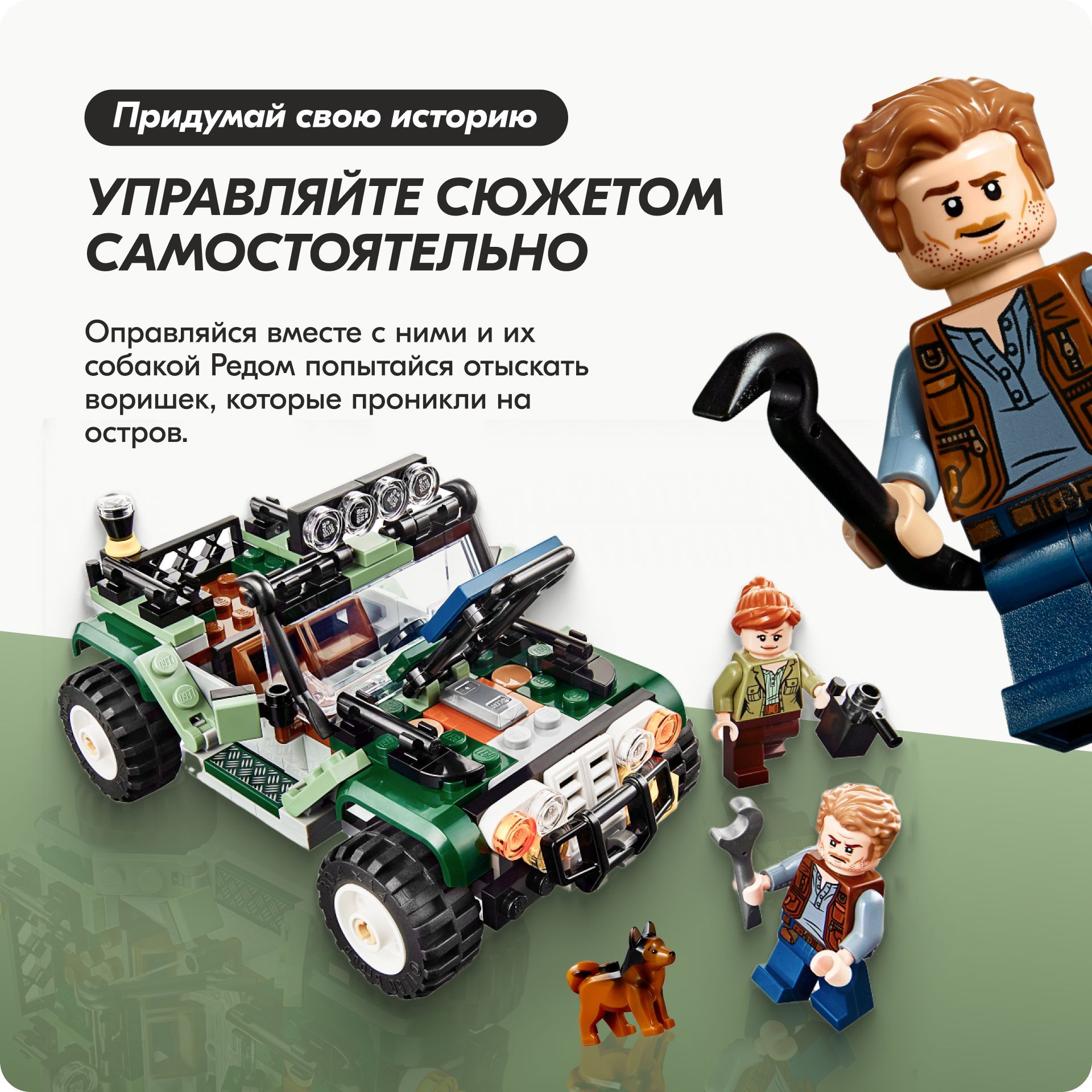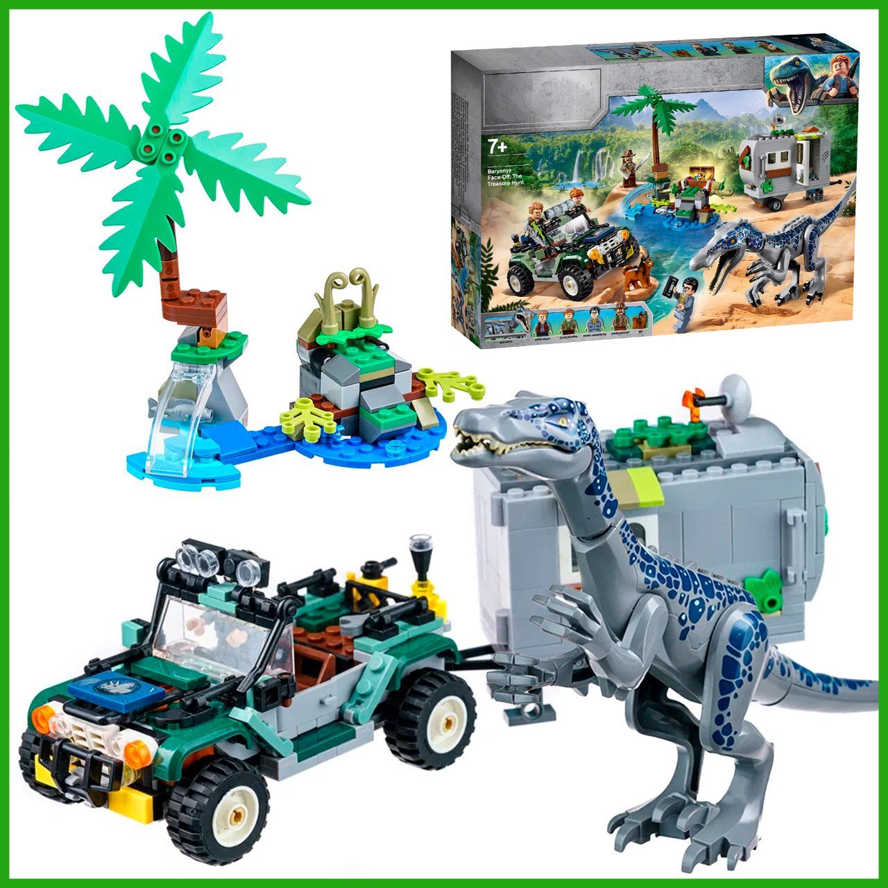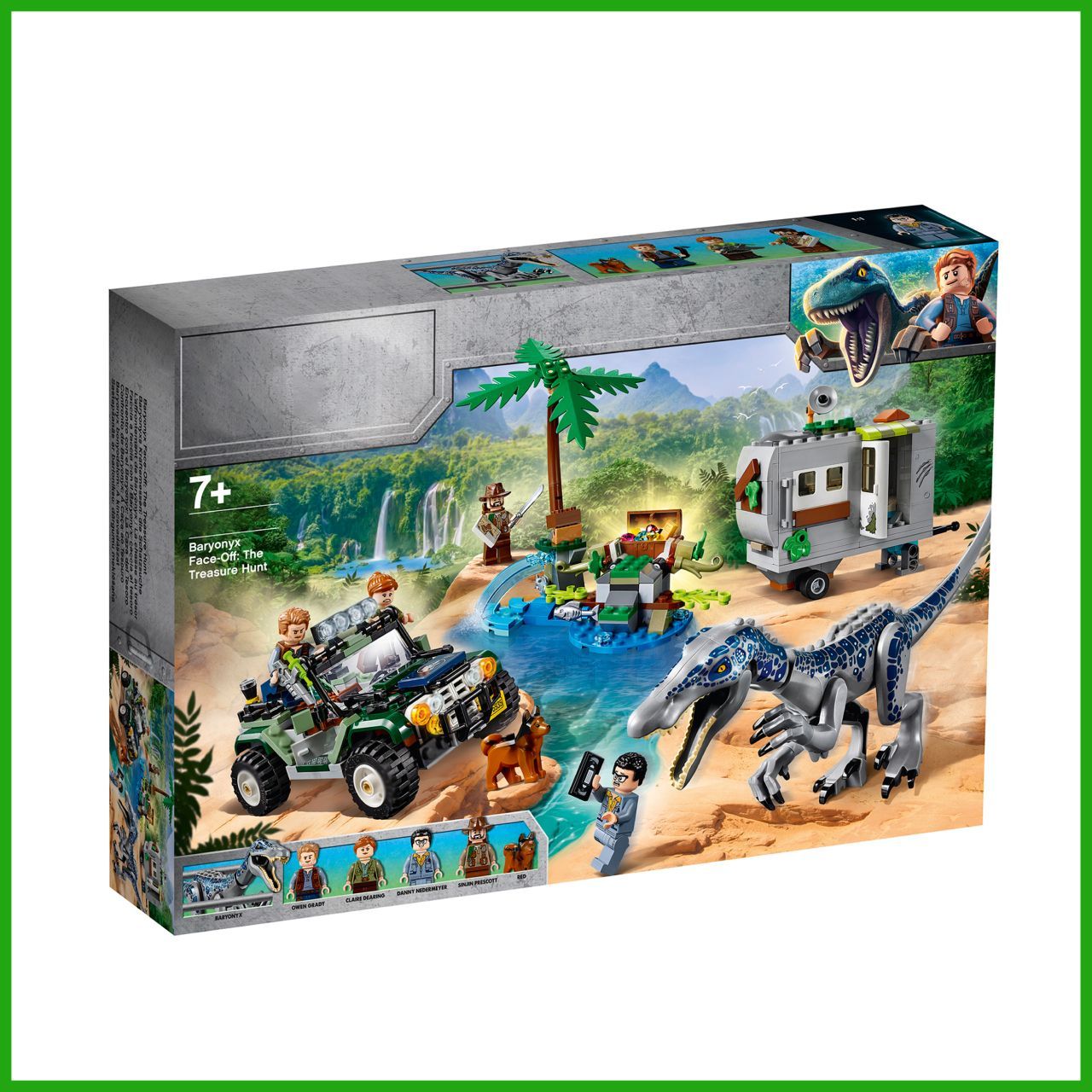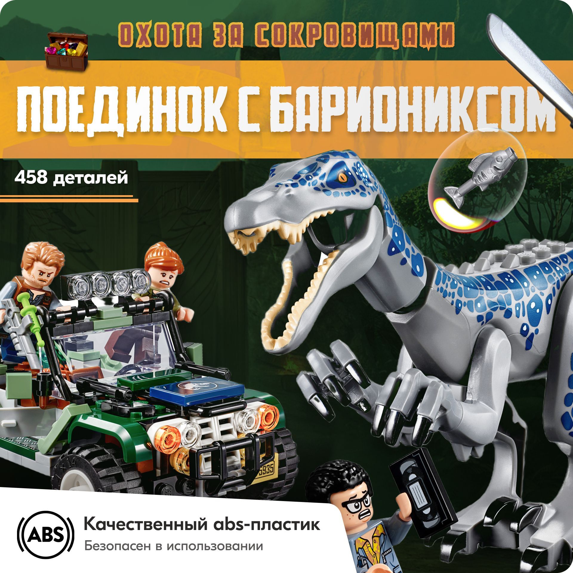 Описание: Поединок с бариониксом Барионикс решил, что Дэнни с Синджином хотят украсть его рыбу. У литой фигурки барионикса гнущиеся руки, ноги и голова, а также подвижная челюсть.Интерактивные деталиЧтобы открыть спрятанный сундук с сокровищами, нажмите на рычаг.Интересный прицепПрицеп оснащен сборной антенной, растениями, открывающимися дверцами, кроватью, компьютером, детально проработанным интерьером и такими аксессуарами, как киносъемочная камера, кружка, сковорода.Оружие героевМачете и пистолет с транквилизатором – поможет ребятам придумать множество сюжетов для захватывающей игры.Знакомые героиБлагодаря 4 реалистичным минифигуркам и динозавру конструктор по мотивам фильма отлично подойдет для командно-ролевой игры. Дэнни Недермейера, Клэр Диринг, Оуэна Грейди, Синджина Прескотта.Сюжетная линияОтправляйтесь в Парк Юрского периода с конструктором «Поединок с бариониксом: охота за сокровищами». Синджин Прескотт и Дэнни Нидермейер затеяли опасную игру. Согласно древней легенде, в джунглях спрятаны несметные сокровища. Старая видеокассета и карта могут помочь героям отыскать желанный клад. Барионикс решил, что Дэнни с Синджином хотят украсть его рыбу, и теперь героям придется хорошо прятаться в своем видавшем виды трейлере. Помогите Клэр Диринг и Оуэну Грейди починить старый внедорожник. Вместе с героями и их собакой Редом вы отыщете воришек, которые прокрались на остров.Отличный подарок ребенкуИгровой набор по мотивам истории Мира Юрского периода – лучший подарок ребенку от 7 лет.Открой новый мирНевероятный коллекционный набор «Мир юрского периода» для захватывающих ролевых игр с динозаврами и поиска сокровищ! Мир юрского периода и приключения жду тебя.