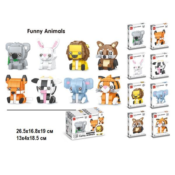 Описание: Мини конструктор ярких представителей животного мира «Funny Animals». Полная коллекция представляет собой 8 веселых животных: корова, лев, енот, тигр, слон, кролик, лиса, коала. Высота собранного конструктора – 5.0-6,0 см.