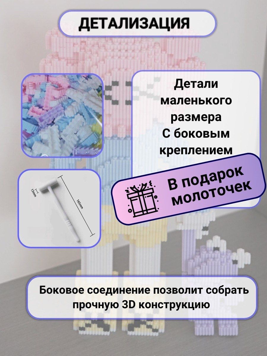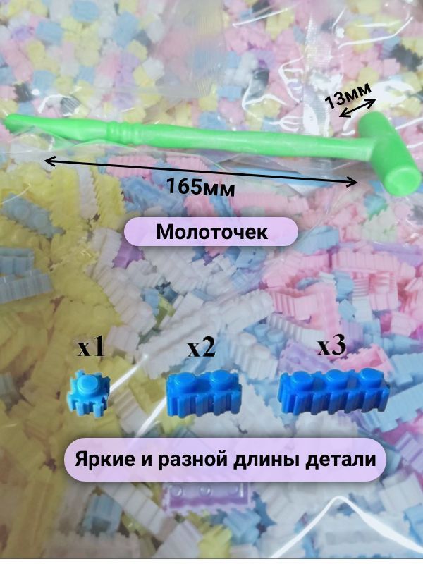 Игрушка развивает моторику рук, а также логическое мышление ребят. Конструктор состоит из множества небольших блоков, которые присоединяются друг к другу и конструируют 3D фигуру, для уплотнения зазоров используется молоточек, который идет в комплекте.Размер:36х25х10
