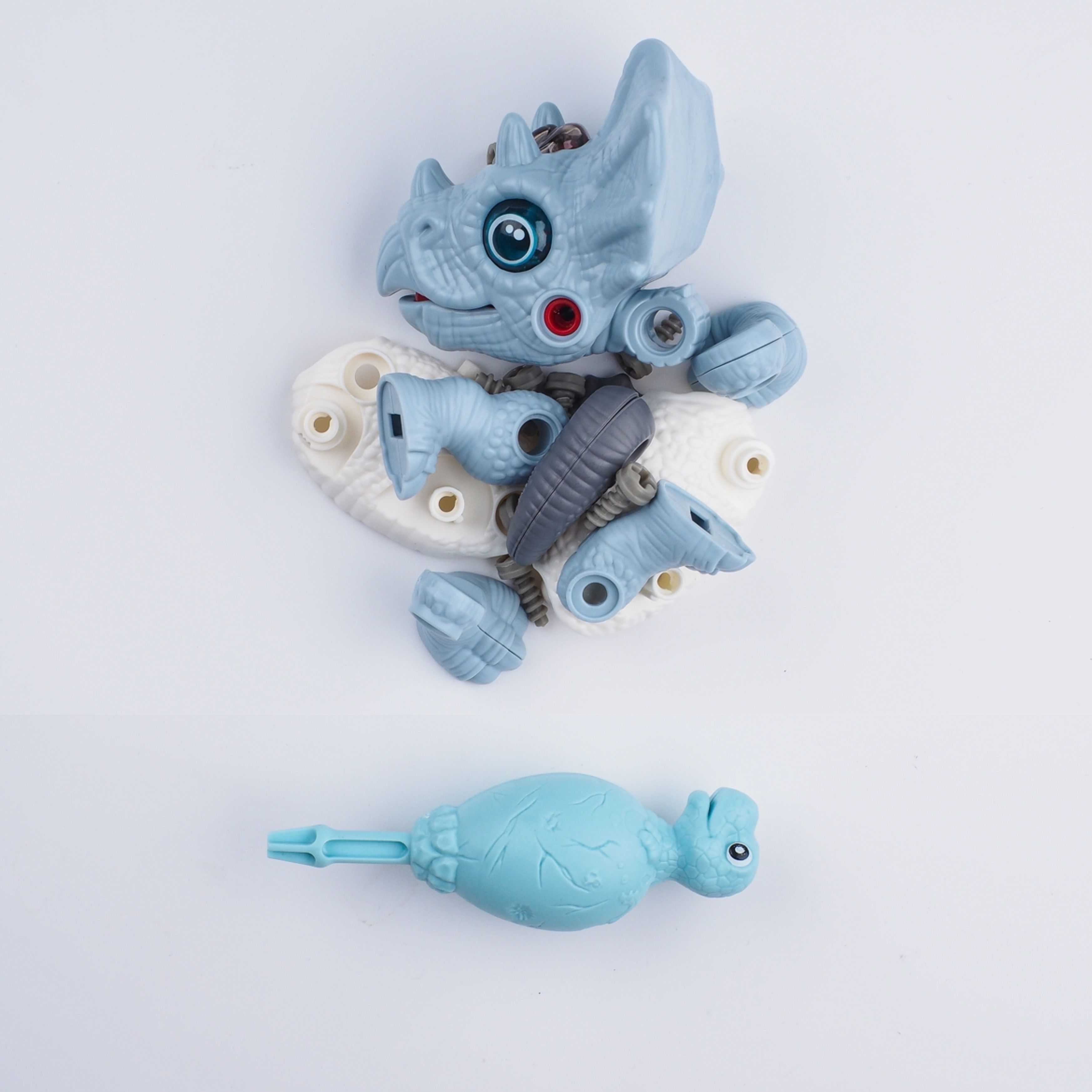 Питание электрической системы игрушки осуществляется от батареек. В набор входит 21 крупная пластмассовая деталь, которые соединяются 8-ю болтами, входящими в комплект и отвёртка. Обращает на себя внимание ручка шуруповёрта, выполненная в виде вылупившегося из яйца крошечного динозаврика. Блоки достаточно крупные, поэтому конструктор подходит даже для малышей. Шлицы шурупов большие и глубокие, поэтому их вкручивание и выкручивание никаких сложностей не вызывает.