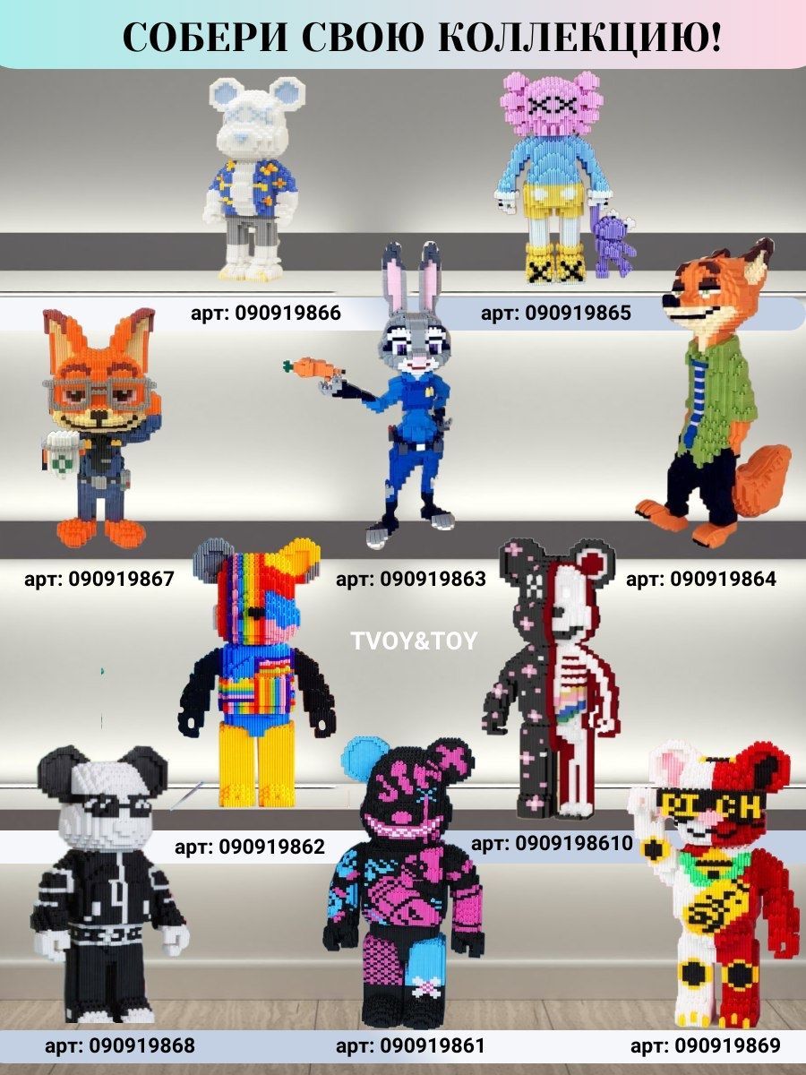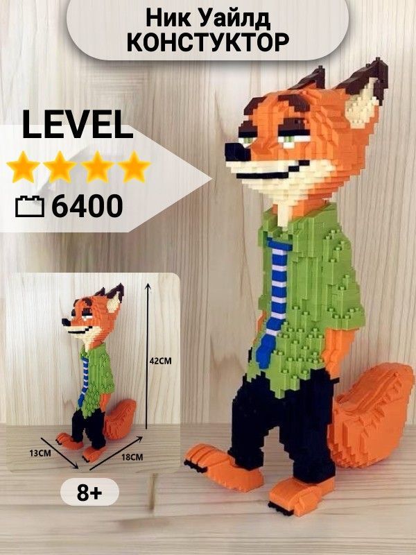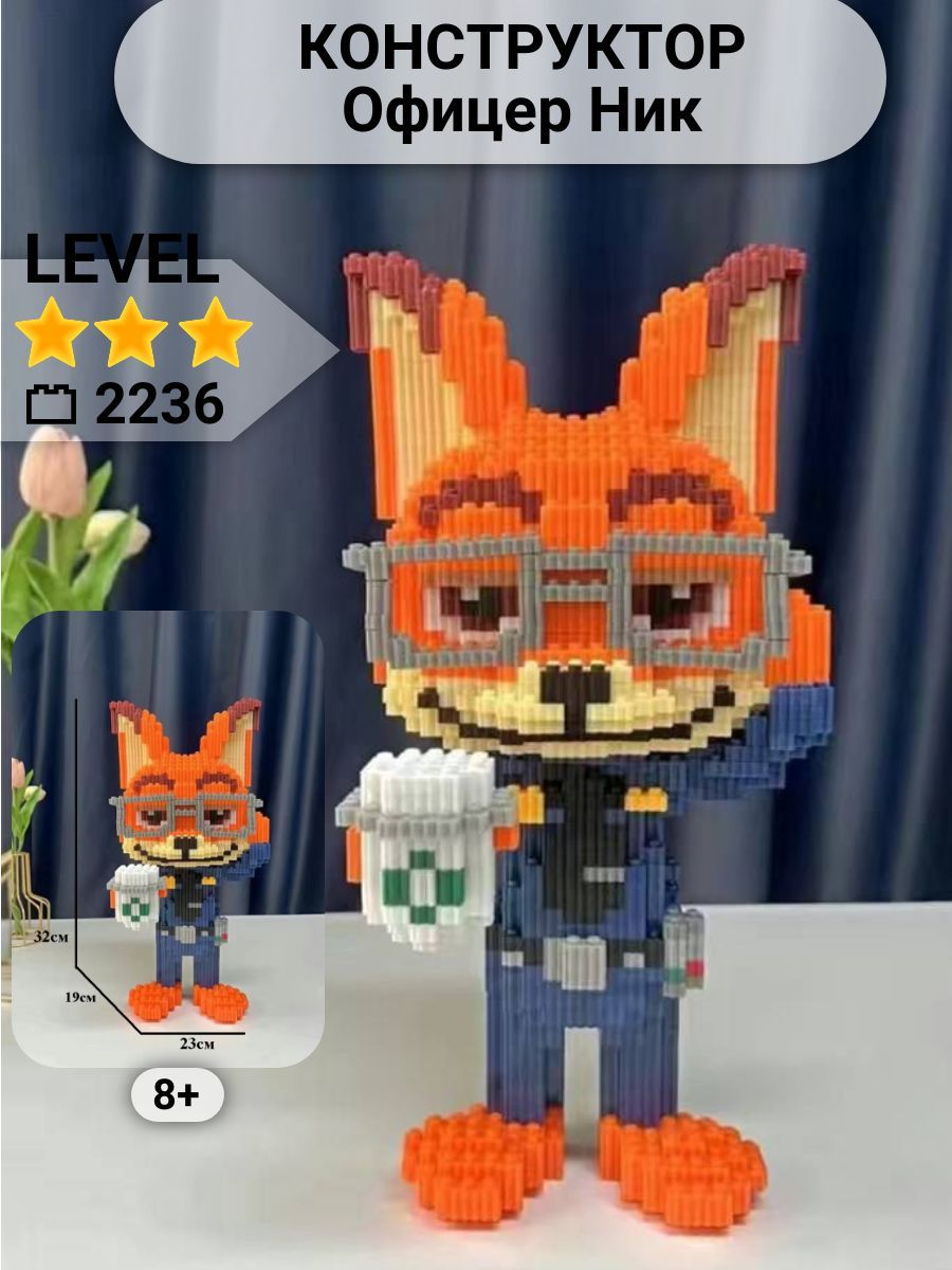 ИНСТРУКЦИЯ в комплектеС ним сможет справиться каждый ребенок от 8+, а также взрослый. Он легок в сборке, в набор входит подробная инструкция.Размер: 20х15х33Украшение интерьераЛис в собранном виде будет украшать любой интерьер. Данная модель, популяризирована среди известных публичных личностей. Конструктор НЕ совместим с Лего Lego, его детали значительно меньше по размеру. Игрушка упакована в красивую коробку, идеально подходит в подарок. Посмотреть весь ассортимент можно в нашем магазине.Джуди Хоппс "Зверополис"Артикул: 090919863BearbrickАртикул: 090919861Ник Уайлд