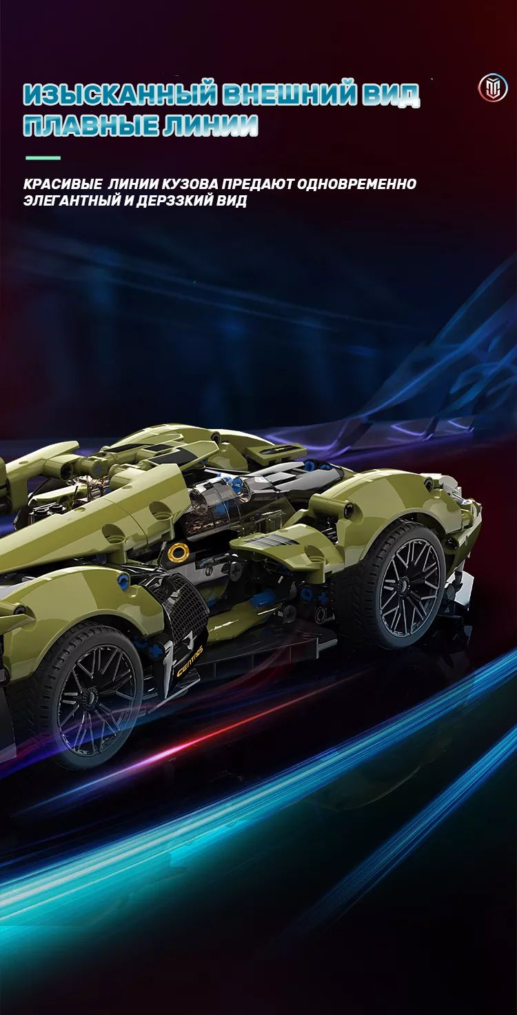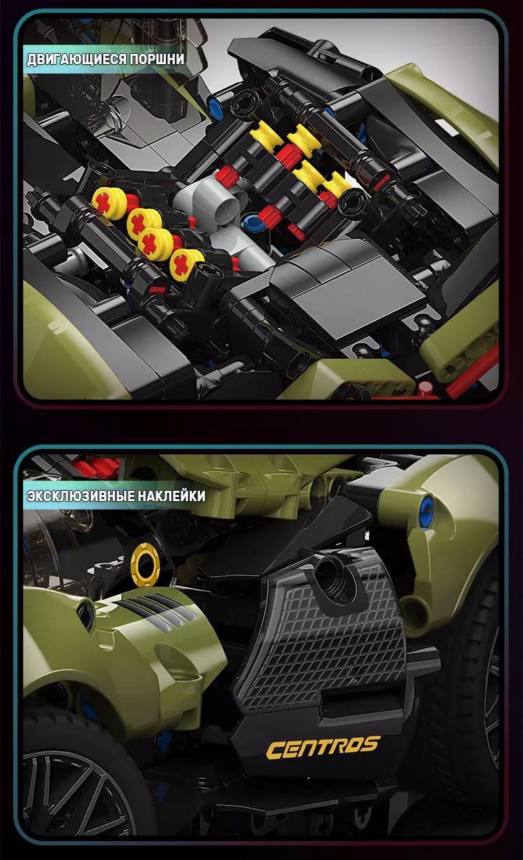Описание: Конструктор для мальчика в виде гоночной машины, который состоит из 847 мелких деталей. В собранном виде у машины крутятся колеса, двигаются поршни двигателя. Размер игрового набора в собранном виде: длина машины - 34,8 см., высота - 9,1 см., ширина - 16,1 см. Все элементы конструктора выполнены из пластика высочайшего качества. Детский конструктор прекрасно формирует навыки мелкой моторики рук, развивает внимание, усидчивость и ловкость, пространственное мышление, воображение и логику, творческие способности, дарит ребенку яркие эмоции! Собирайте 3D конструктор, коллекционируйте модели и играйте всей семьей, присоединяйтесь к командам для участия в крутых детских гонках спорткаров! Машинка игрушка, базирующаяся на 4-х покрытых низкопрофильными шинами, колесах позволяет развивать невиданную скорость с самого старта, шины и диски собираются отдельно. Поворачивайте передние колеса с помощью руля, почувствуйте себя гонщиком спорткара. Двигатель автомобиля создает имитацию работы двигателя за счёт подвижных поршней. Гоночный задний спойлер и спортивный обвес создают вид настоящей спортивной машины.
