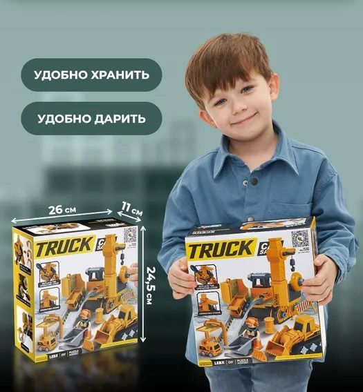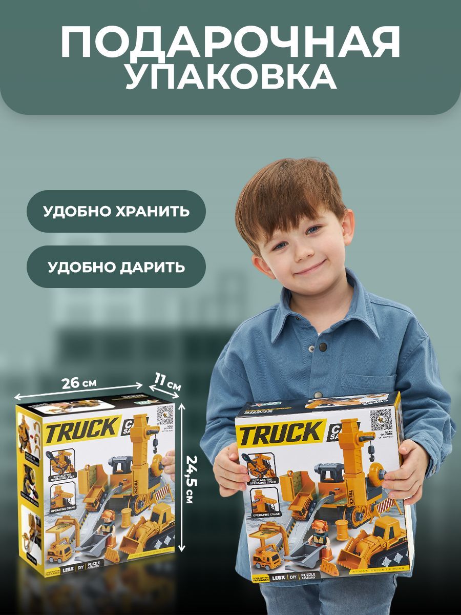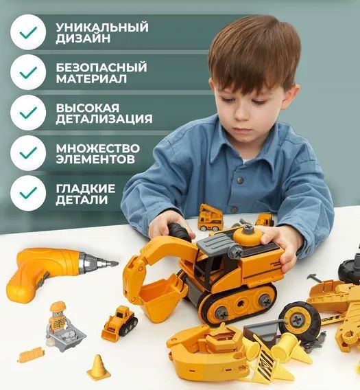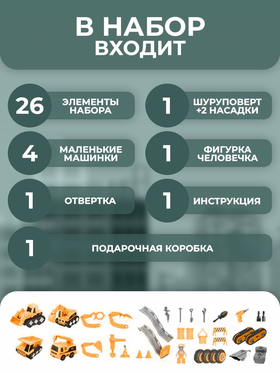 Описание: Стройплощадка3d констуктор включает 4 большие и 4 маленькие машинки, также в комплект входит фигурка мини человека и почти настоящий электрический шуруповерт. Детская игра с данным набором способствует интеллектуальному развитию детей, развивает логическое мышление и память.
