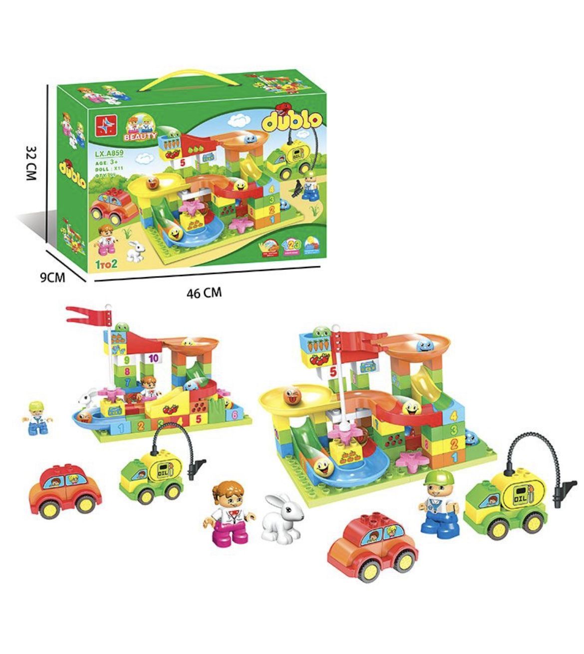 Описание: Конструктор Веселые горкиНабор Дупло «Веселые горки» включает в себя 99 различных ярких пластиковых элементов конструктора, в том числе кубики для постройки горки, домика, машинок, забора, заправки, фигурки детей, фигурки животных.