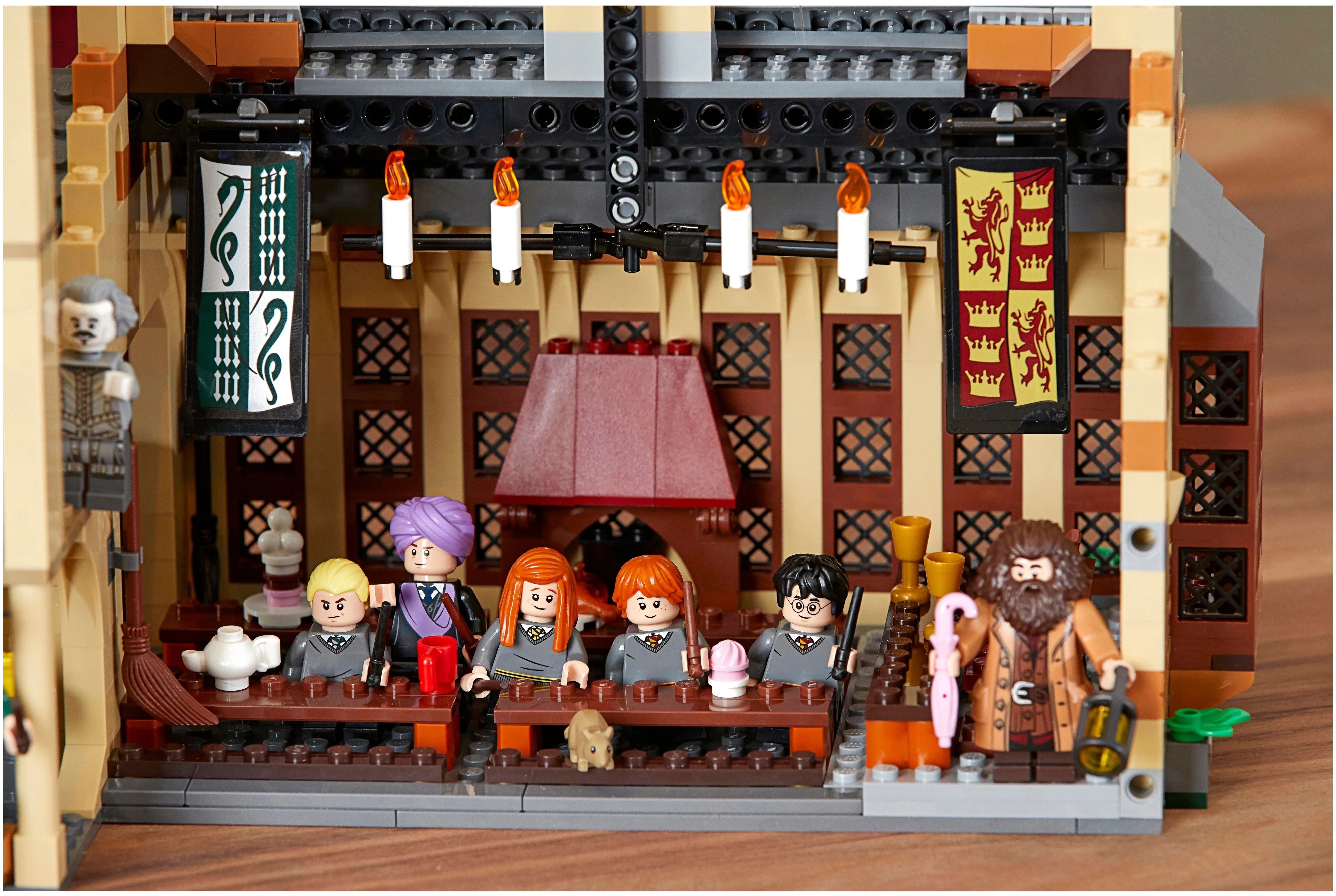 Большой зал Хогвардса, конструктор серии Гарри Поттер. В наборе вы найдете 10 минифигурок: Гарри Поттер, Гермиона, Рон Уизли, Драко Малфой, Сьюзан Боунс, профессор Минерва МакГонагалл, Квиринус Квиррелл с лицом Лорда Воландеморта, Хагрид, Альбус дамблдор, безголовый Ник, феникс, василиск, скаббер.