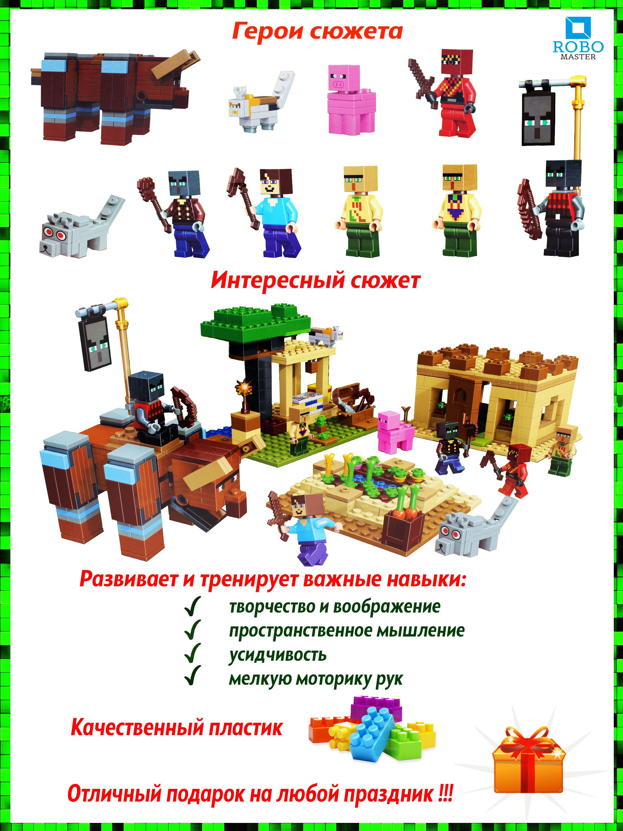 Набор создан из качественного ABS пластика - он безопасен для детей, не имеет острых углов и заусенцев по краям. Все элементы набора minecraft находятся в упаковке и всегда соединяются с деталями конструктора и не выпадают при строительстве.КомплектацияИгры с конструктором направлены на развитие вашего ребенка!