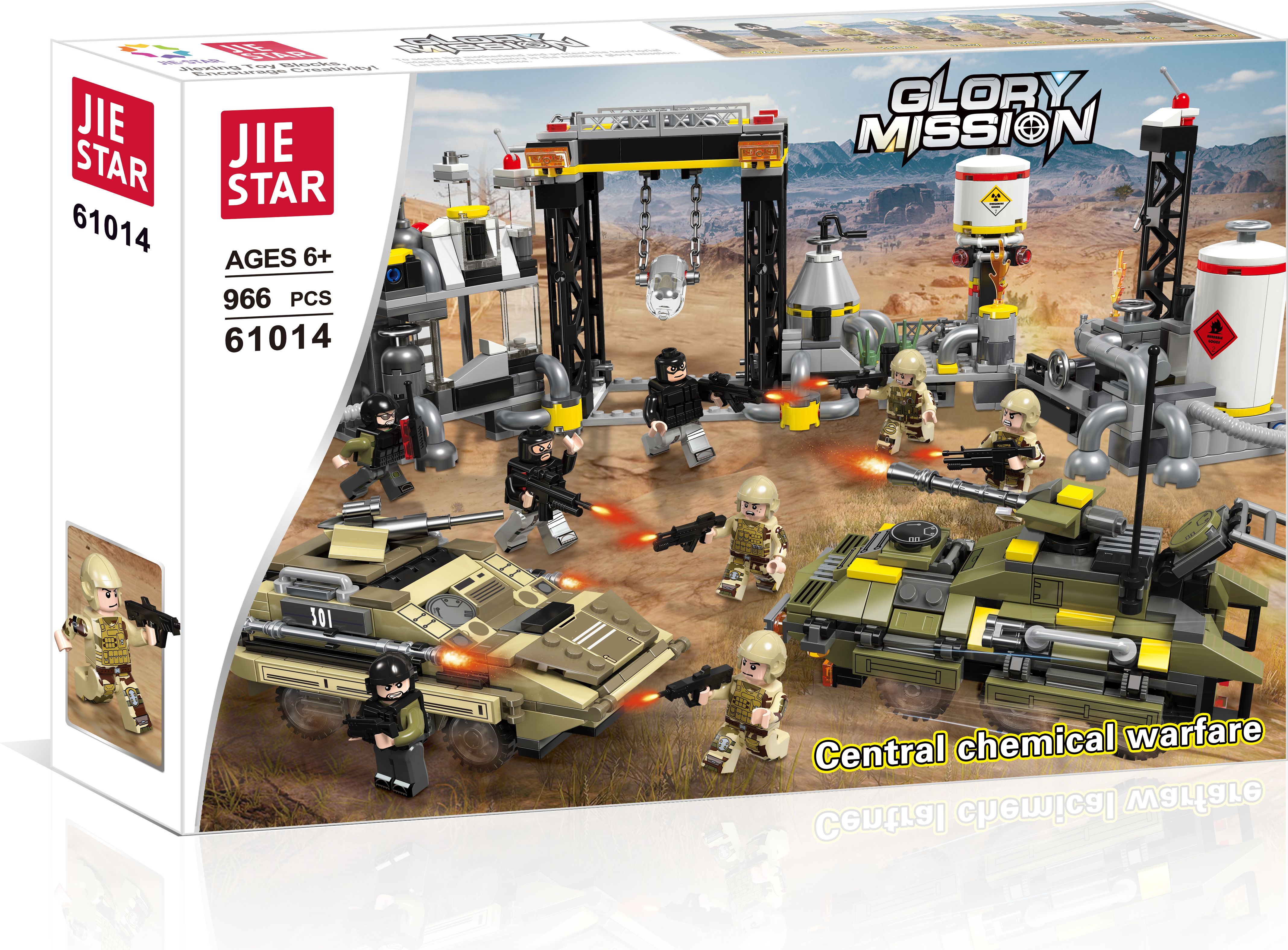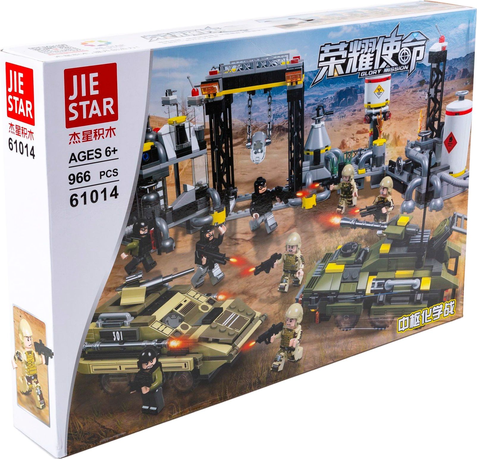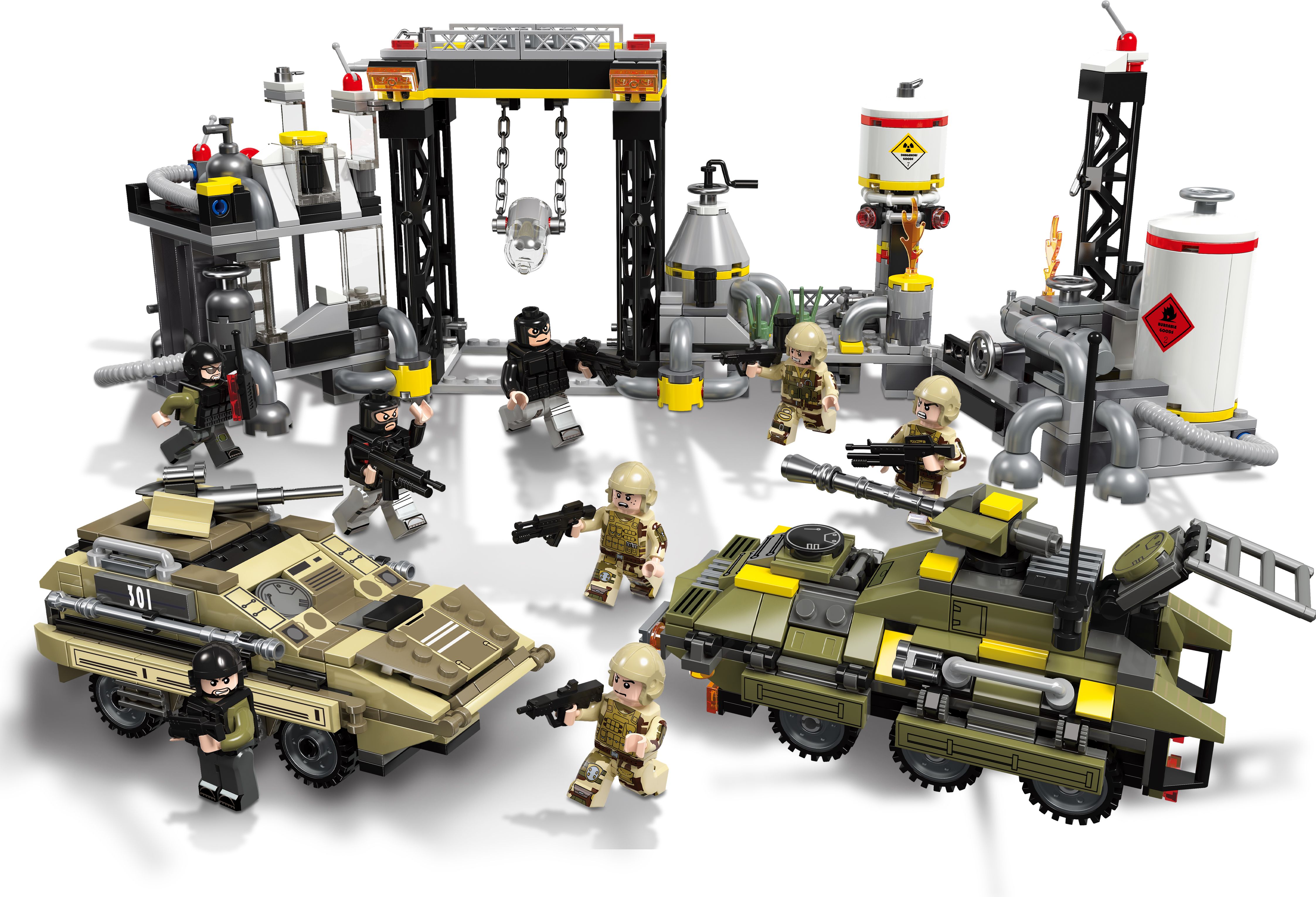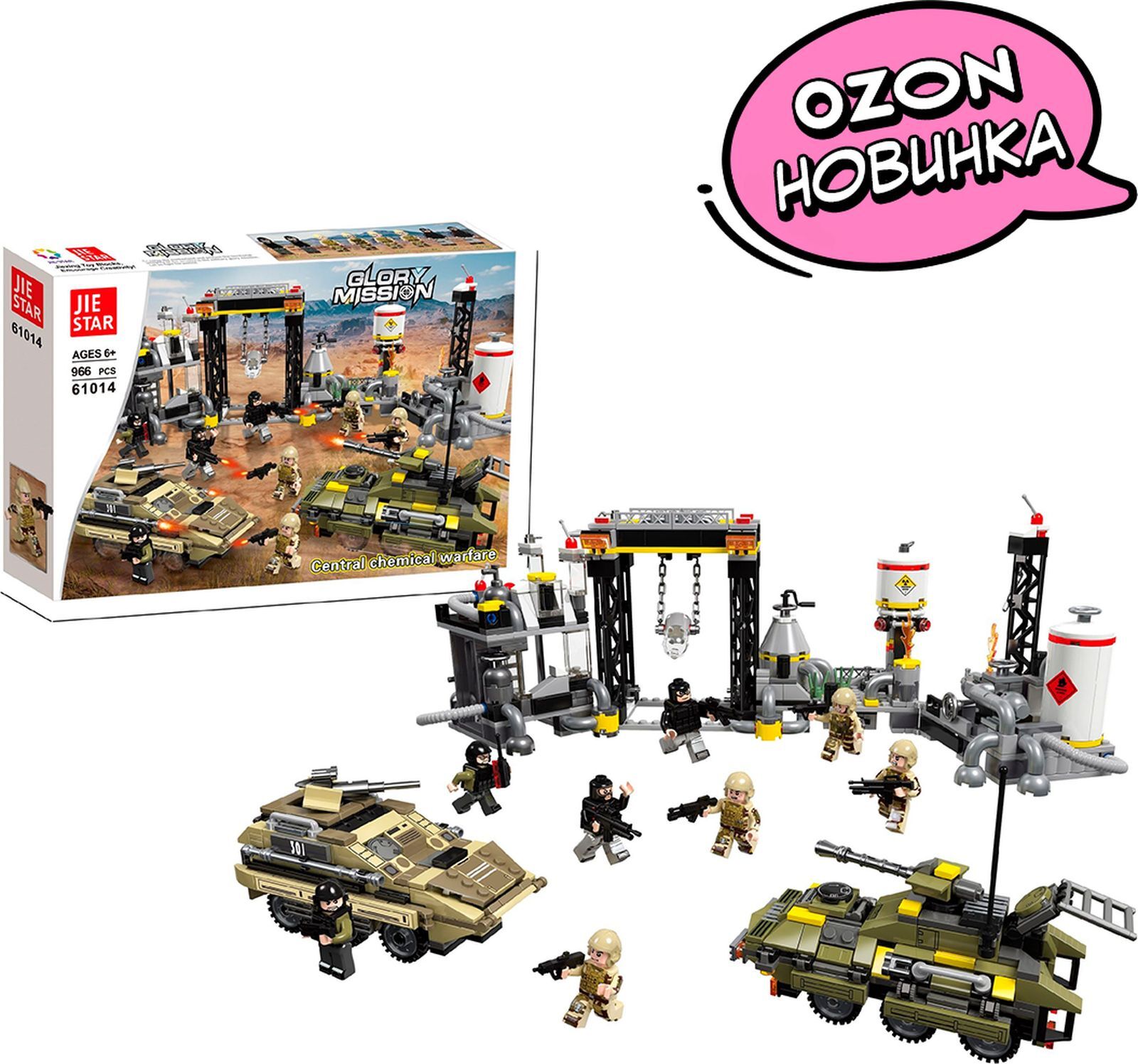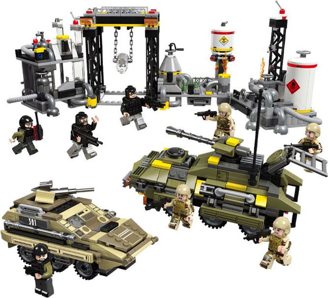Конструктор JIESTAR включает в себя 966 деталей, включая фигурки, необходимые детали для постройки химического завода и бронетранспортеров