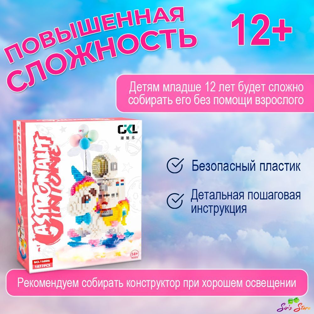 Развивающая игрушка!Конструктор, способствующий развитию логического мышления, а также терпения и настойчивости. Детализация каждой детали высокого уровня обеспечивает создание реалистичной и проработанной модели.Возрастное ограничение!Конструктор состоит из 1877 деталей (миниблоков). Мы создали их специально маленькими, что позволило нам сделать высокую степень детализации. Это стоит учитывать при покупки конструктора, ведь слишком юным друзьям собрать его без помощи взрослых будет затруднительно. Мы рекомендуем конструктор от 12 лет, учитывая размер деталей и повышенный уровень сложности.Еще больше преимуществ!Наш Конструктор "Космонавт на единороге" предлагает уникальный опыт творчества для детей и взрослых. Это отличное средство для креативного времяпровождения и подходит для всех возрастов. Собирайте модель сами или делитесь этим захватывающим процессом с близкими.