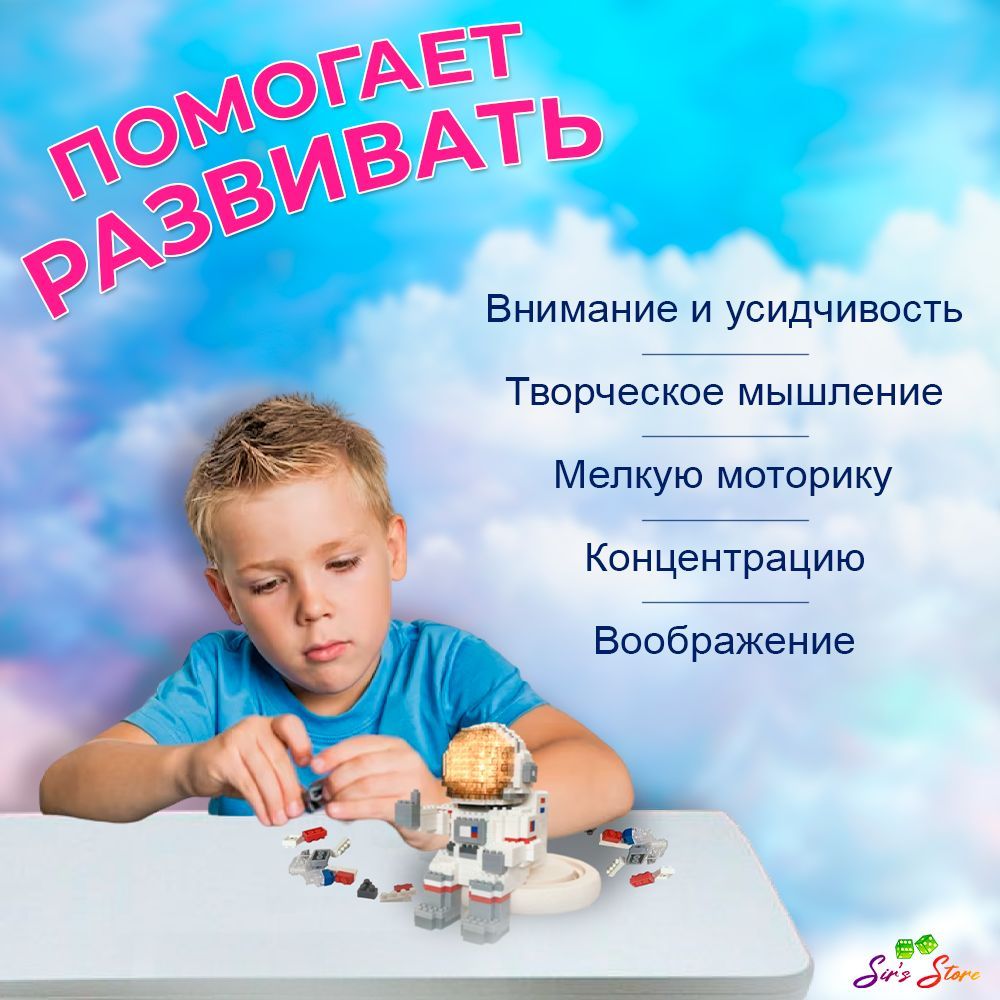 Описание: Конструктор "Космонавт на единороге" с подсветкой Отправляйтесь в увлекательное путешествие: Конструктор "Космонавт на единороге" с подсветкой и повышенной сложностью. Раскройте свой потенциал творчества с нашим уникальным Конструктором "Космонавт на единороге". Этот интеллектуальный конструктор подойдет как детям, так и взрослым, идеально подходит для тех, кто ценит вызовы и стремится развить свою логику.Особенности конструктораОн светится!Подсветка, придающая вашей модели загадочную атмосферу и добавляющая интересный акцент. Космонавт мечтатель может стать не только любимой игрушкой и сборной моделью для ребенка, но и использоваться в качестве ночника. Но стоит учитывать, что свечение происходит на светодиодной нити благодаря действию батареек типа AG13 (круглые). Он не заряжается от сети и для постоянного использования в качестве ночника для детей необходимо будет менять батарейки. Сами батарейки идут в комплекте.Необычный конструктор с боковыми креплениями!Повышенная сложность сборки, что позволяет вам окунуться в захватывающий мир творчества и достичь впечатляющих результатов. Этот конструктор выделяется повышенным уровнем сложности. Каждая деталь имеет боковые крепления. Это позволило нам увеличить прочность конструкции и добавить повышенный уровень сложности. Теперь, чтобы собрать конструктор, нужно будет не только ставить детали друг на друга, но и соединять их боковые крепления. Это увеличивает сложность, но и добавляет интерес сборщику. Теперь конструктор будет не только конструктором для детей, но и подойдет в качестве конструктора для взрослых!
