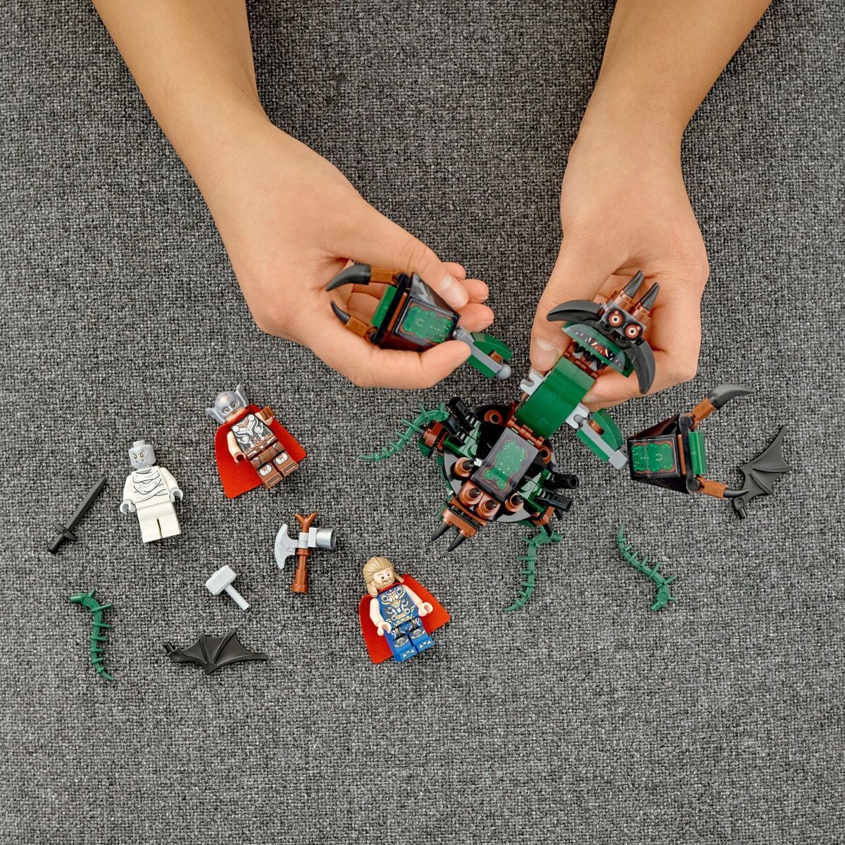 • Культовые персонажи Marvel. Пригласите минифигурки Тора, Могучего Тора и Горры, чтобы поиграть с ними творчески и поставить их на полку, а также теневого монстра со сборными шарнирными руками и когтями.