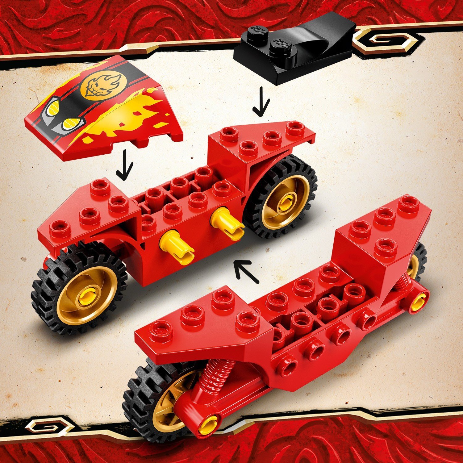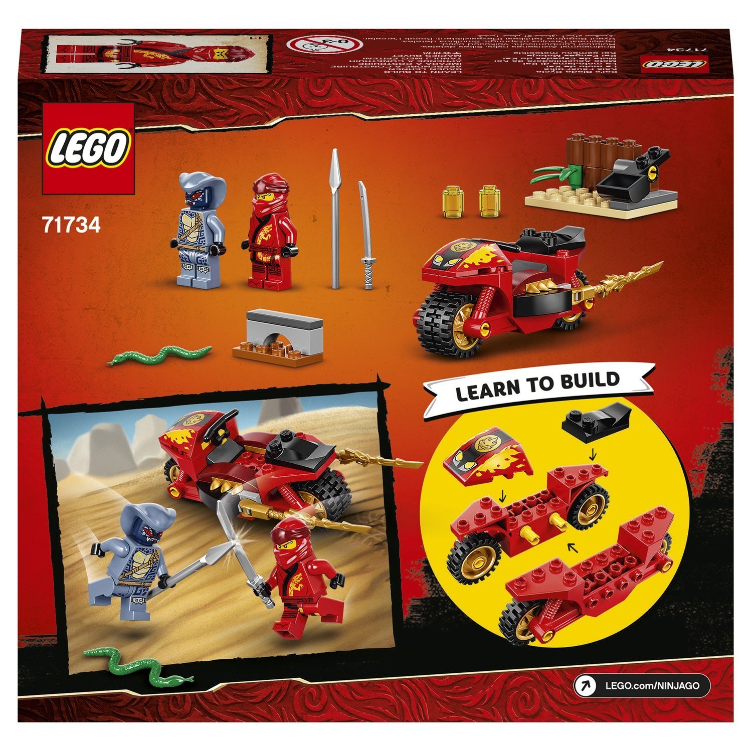 Описание: Сразитесь с опасным звериным воином Раттлом при помощи конструктора LEGO NINJAGO 71734 «Мотоцикл Кая». Кай уже выехал на мотоцикле, присоединяйтесь и вы. Садитесь за руль красно-черно-золотого байка и поспешите на помощь. Но будьте предельно осторожны: из катапульты Раттла летят смертельные ракеты. Схватите меч и помогите ниндзя одержать победу. Сможете ли вы справиться с наступающими силами зла? Все будет зависеть только от вашего воображения и настроения. Игровой набор с мотоциклом – отличный подарок ребенку дошкольного возраста (от 4 лет и старше) на 1 Июня, Новый год, день рождения, 8 Марта, 23 Февраля или любой другой праздник.