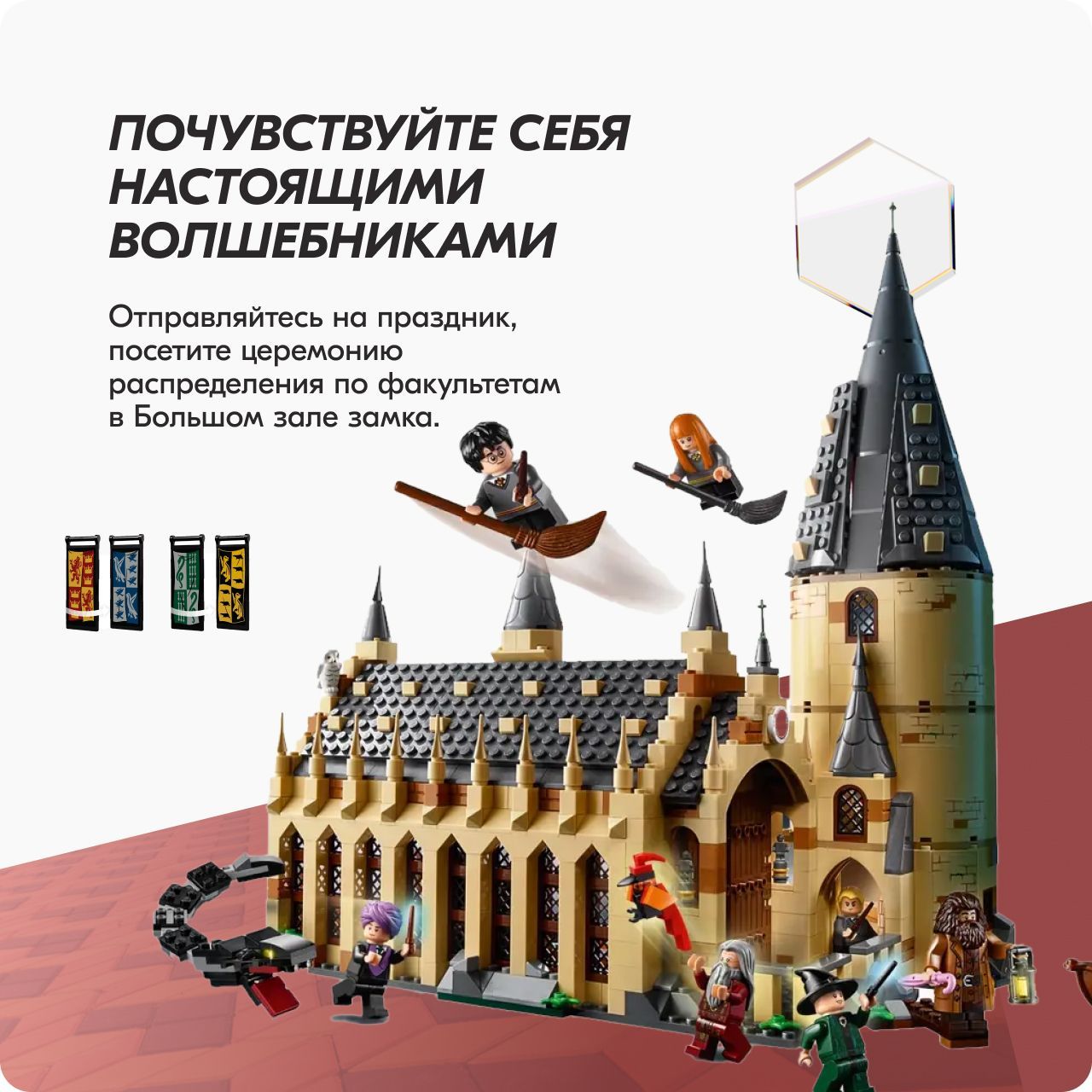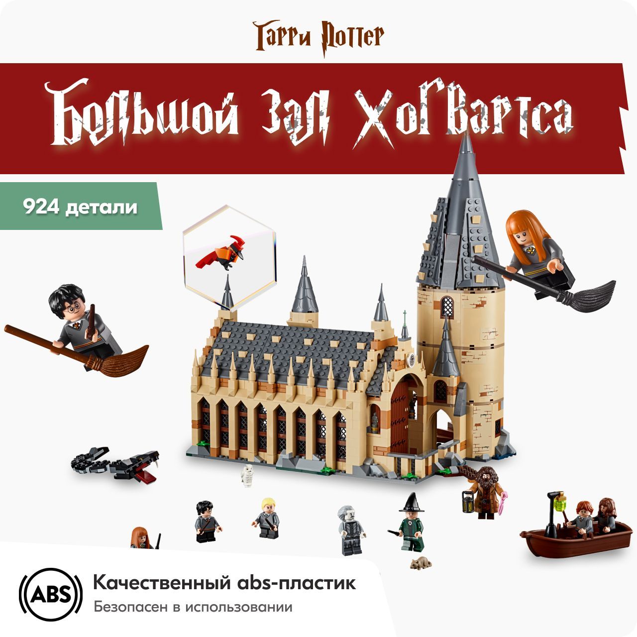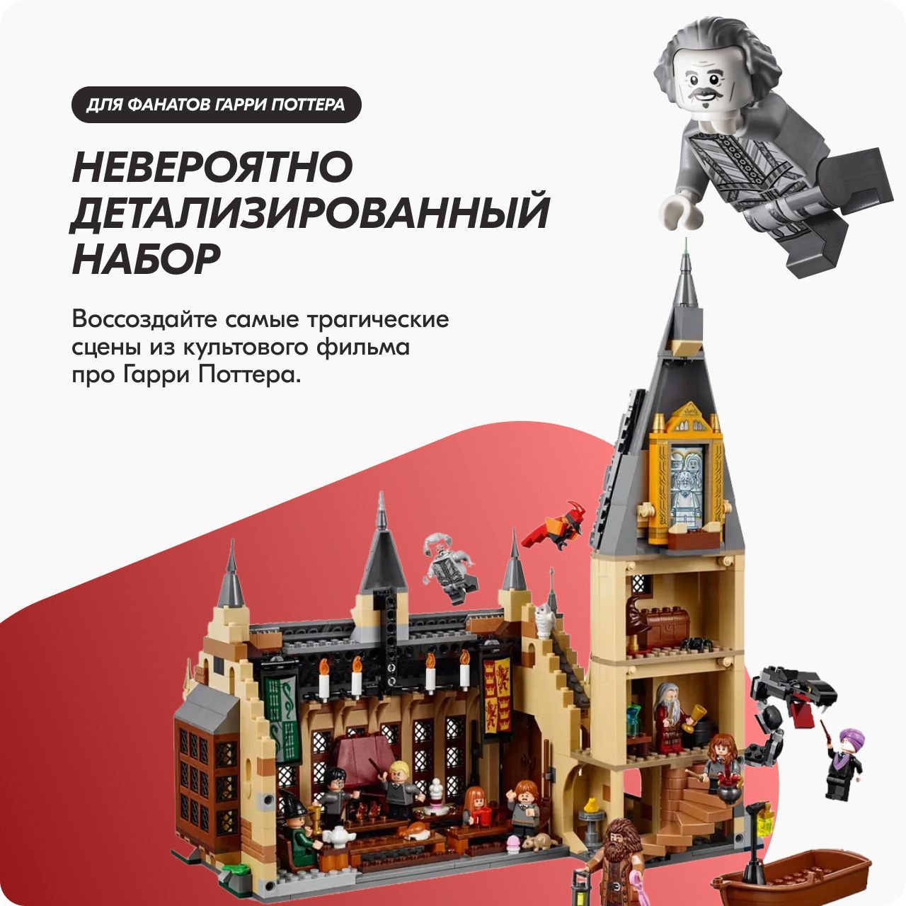 Загляни внутрьМечтаете очутиться в Большом зале Хогвартса и попасть в мир знаменитой школы волшебства?Лучший подарок Этот набор станет отличным подарком для любого маленького и взрослого поклонника уже ставшей классической киносаги про волшебника со шрамом.Готовы к приключениям?Благодаря этому набору вы сможете собрать невероятно детализированную модель Хогвартса с Большим залом, движущейся лестницей, учебным классом и комнатой с волшебными предметами, а еще лодку и самого Василиска!Развивает воображениеИгровой набор отлично развивает мелкую моторику, воображение, фантазию, усидчивость, творческое и пространственное мышление.