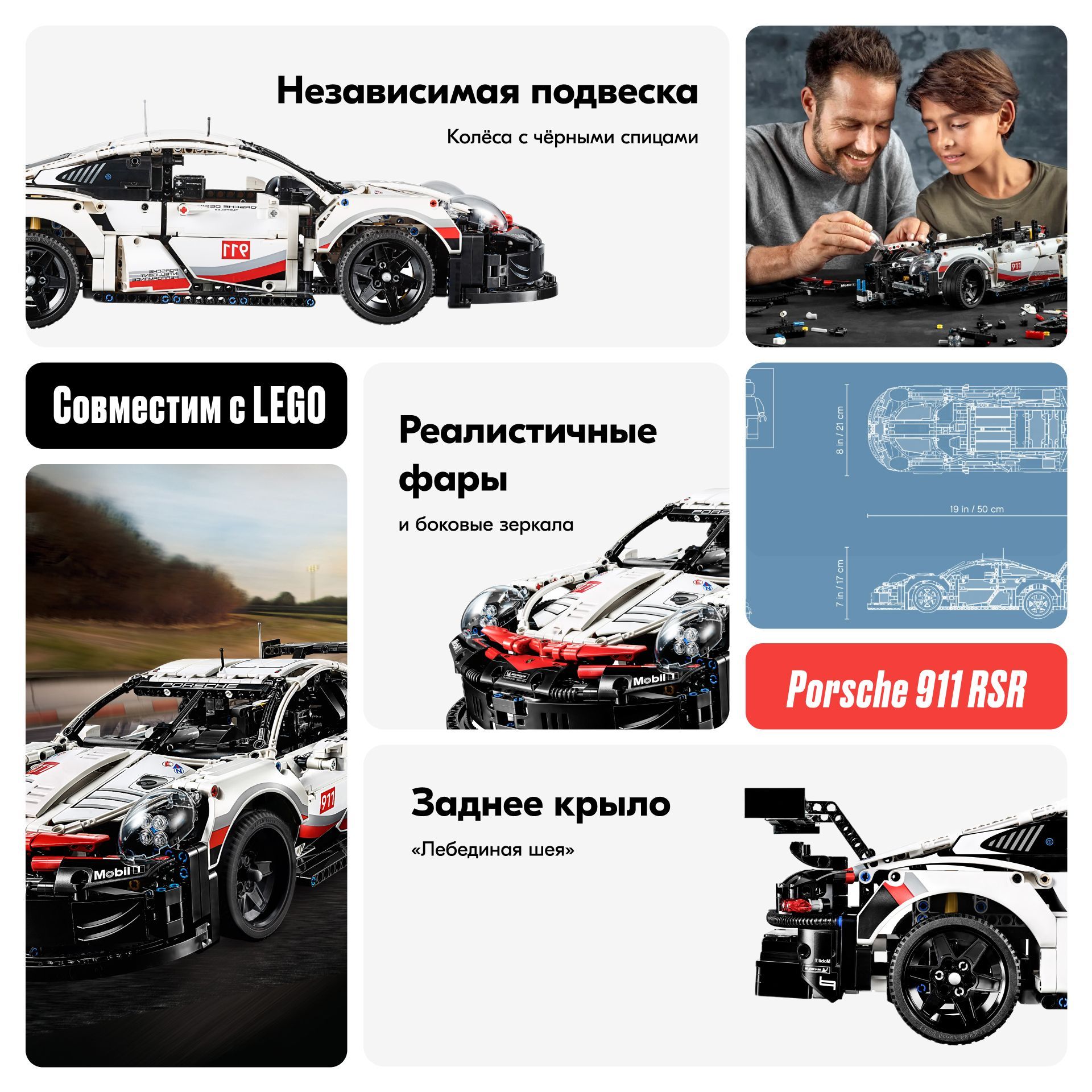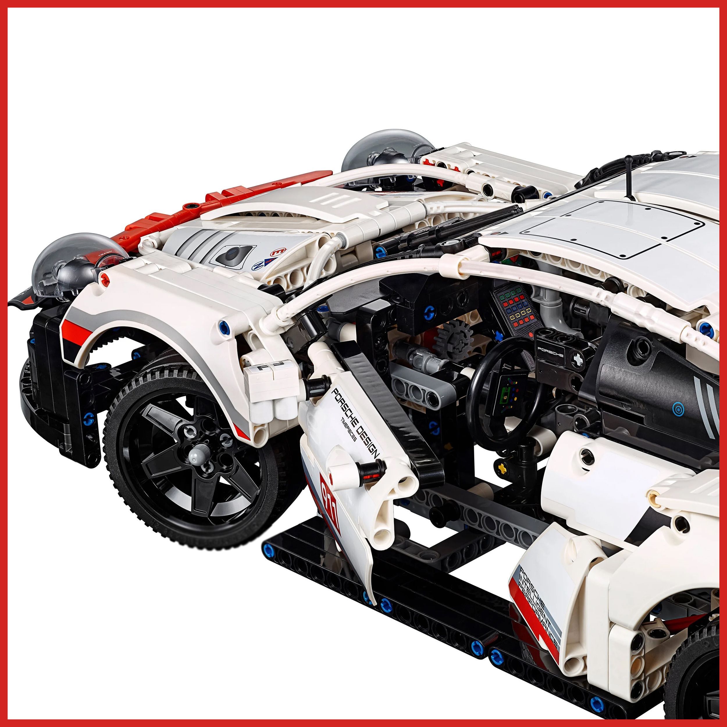 Описание: Интерактивный салонОткрыв двери, ты обнаружишь салон со множеством реалистичных деталей: экран радара, функционирующее рулевое управление, систему тушения огня и даже карту трека Лагуна Сека, которая напечатана на двери водителя.Изучите технологию машиностроенияОсобенности реалистичного движения и механизмов знакомят молодых строителей с миром машиностроения.Невероятно быстрый Porsche 911Отличается аэродинамическим дизайном с приподнятым задним крылом.Видимый, работающий дифференциалШестицилиндровый оппозитный двигатель с двигающимися поршнями, расположенный перед задней осью