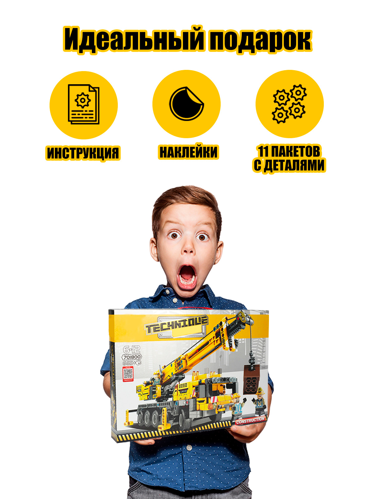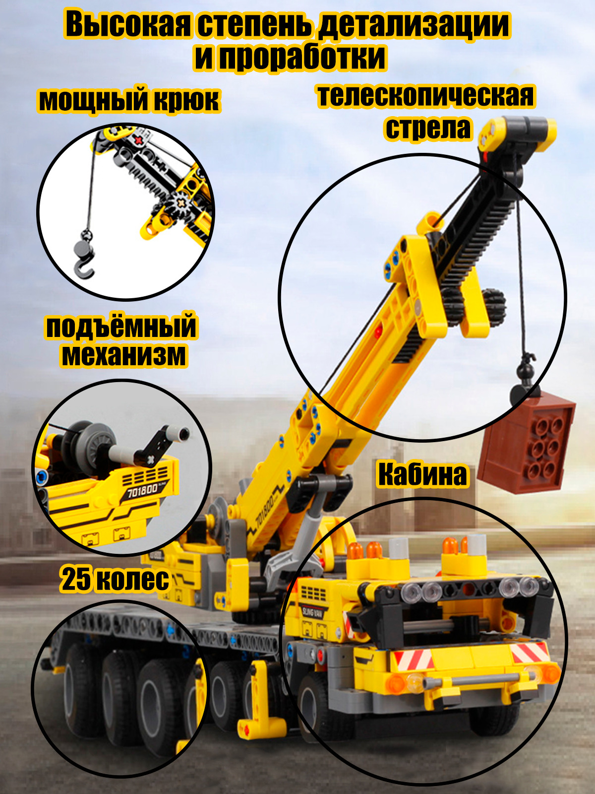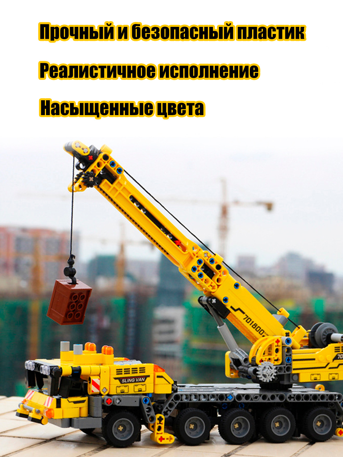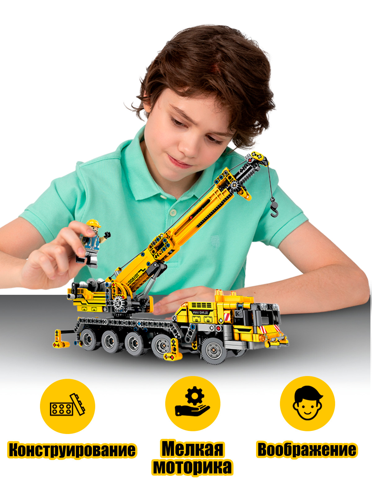 Описание: Конструктор машина WiMi, подъемный кран из 665 деталей, строительная техника из миниблоков с подвижным механизмом, 3 минифигурки в комплекте, сборная модельДетский пластиковый конструктор из миниблоков WiMi – это развивающий игровой набор для мальчиков и девочек, который научит их конструировать, моделировать и создавать. Объемная сборная модель спецтехники с подъемным краном приведет детей в восторг своим реалистичным исполнением, высокой детализацией и подвижным механизмом. Большая строительная машина имеет поворотные колеса и вращающийся корпус. Перед проведением строительных работ автокран необходимо поставить в нужное положение – на выдвижные опоры. Позади кабины расположена площадка с панелью управления, где с помощью специального механизма выдвигается телескопическая стрела с лебедкой, за которую можно прицепить и поднять груз. Блочный конструктор развивает мелкую моторику – модули конструктора небольшие и требуют четких действий, учит концентрироваться и улучшает координацию движений. Совершенствует пространственное и логическое мышление. Игры с уже собранными машинками спецтехники расширяют кругозор и дают возможность придумать новые сюжеты и сценарии для персонажей. В комплект входит 665 деталей, которые без труда соединяются между собой и разъединяются при небольшом усилии. Чтобы игра стала еще более увлекательнее, в набор добавили 3 фигурки человечков – помогут управлять машинками спецтехники, и позволят придумать захватывающие сюжетные истории из роботов и спецтехники со сложными механизмами. Классические детали совместимы с пластиковыми элементами конструкторов популярных брендов. Не имеют острых углов, выполнены из качественного, безопасного для здоровья пластика. Развивающая игрушка в виде блочного конструктора станет идеальным подарком для ребенка на день рождения, 23 февраля, 8 марта или любой праздник для мальчиков и девочек. В коллекции WimiKids вы найдете широкий ассортимент разных сборных моделей игрушек для малышей и школьников. Не забывайте делиться Вашими отзывами в комментариях.Вам также понравится!В каталоге нашего бренда WiMi Вы найдете ещё больше интересных товаров!313516041686825679669845888317396140510559273316093546315265256510358691317399216732067067558321968564542373