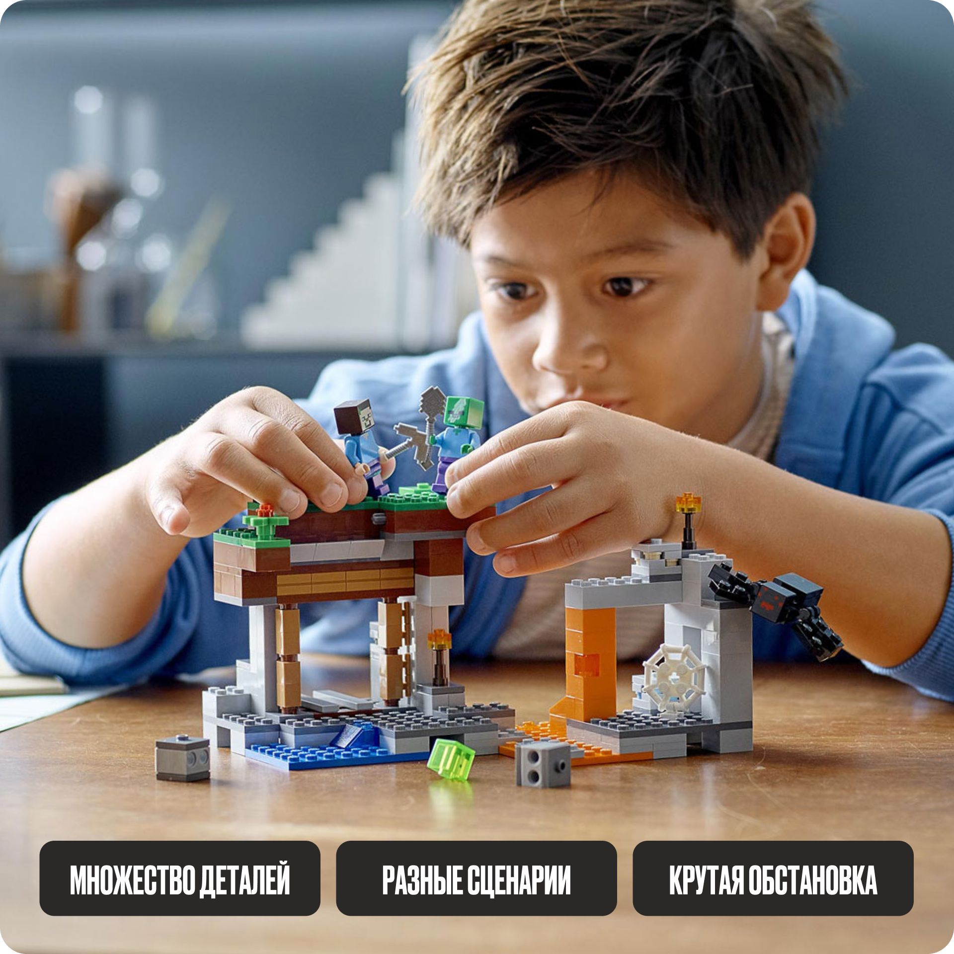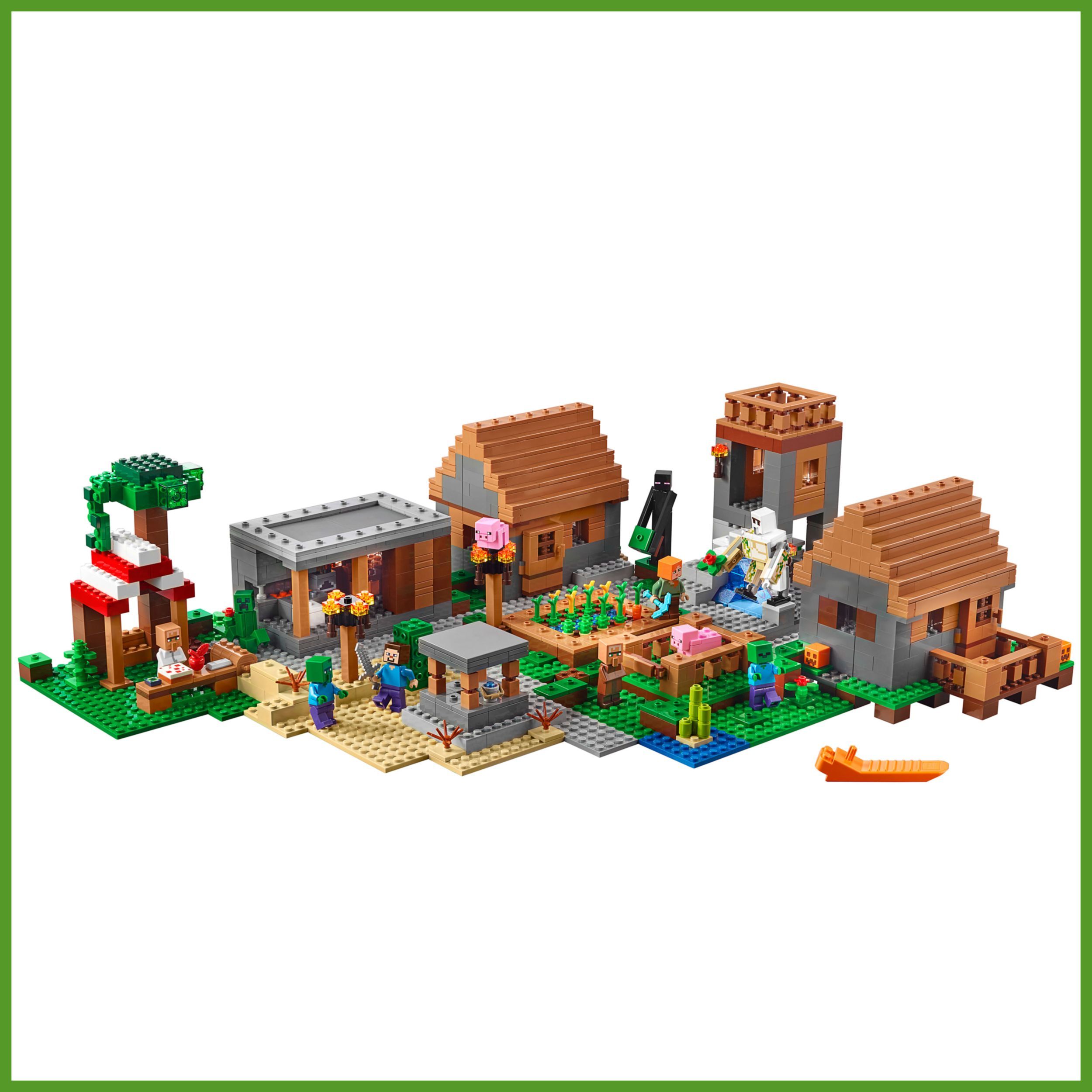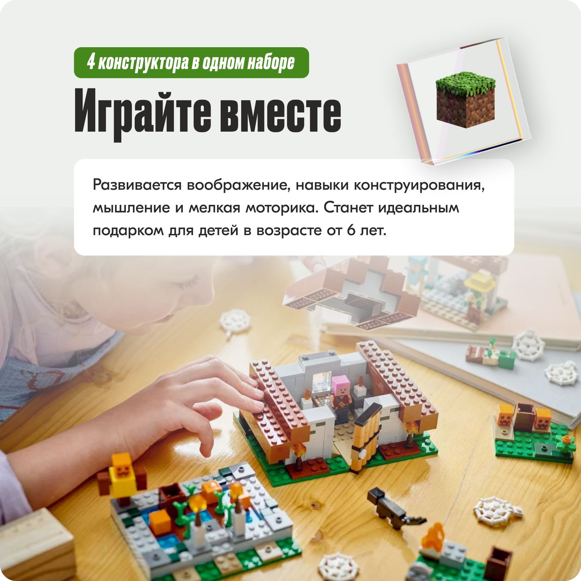 Описание: Стань ремесленникомДобродушные персонажи занимаются ремеслами, возделывают огороды, выращивают скот, торгуют на рынке и даже посещают местную библиотеку.Будь смелымВооружи Стива мечом, чтобы он сразился с враждебными мобами и защитил деревню от их вторжения.Придумай свой сюжетЕсли набор наскучит тебе, собери из его деталей новую конструкцию, и играть снова станет интересно. Деревенская жизньКаждый житель Деревни занят своим делом.