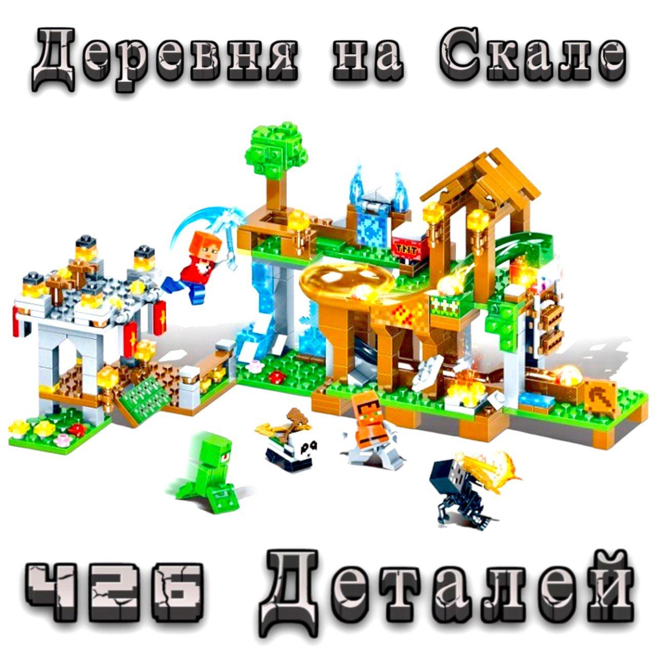 Конструктор Майнкрафт Игрушка Minecraft My World набор "Битва в Деревне на Скале" 426 деталей / 5 фигурок с Led подсветкой ( Большая Деревня с Жителями /совместим с конструкторами лего / подарок для мальчиков )