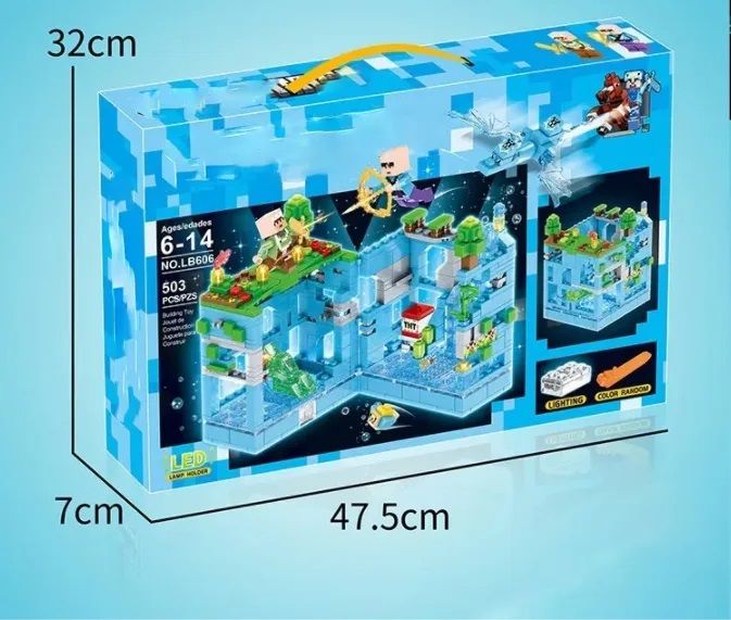 • Функциональный и интересный:Конструктор майнкрафт для мальчиков «Затопленная голубая крепость, Подводная крепость» оснащен светодиодной подсветкой, имитирующей игру света в морских глубинах. А конструкция крепости позволяет раскрыть пластиковый конструктор подобно книжке, предоставляя доступ ко всем этажам здания и расширяя возможности для игры. Совместим с конструкторами Lego.