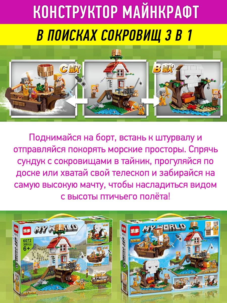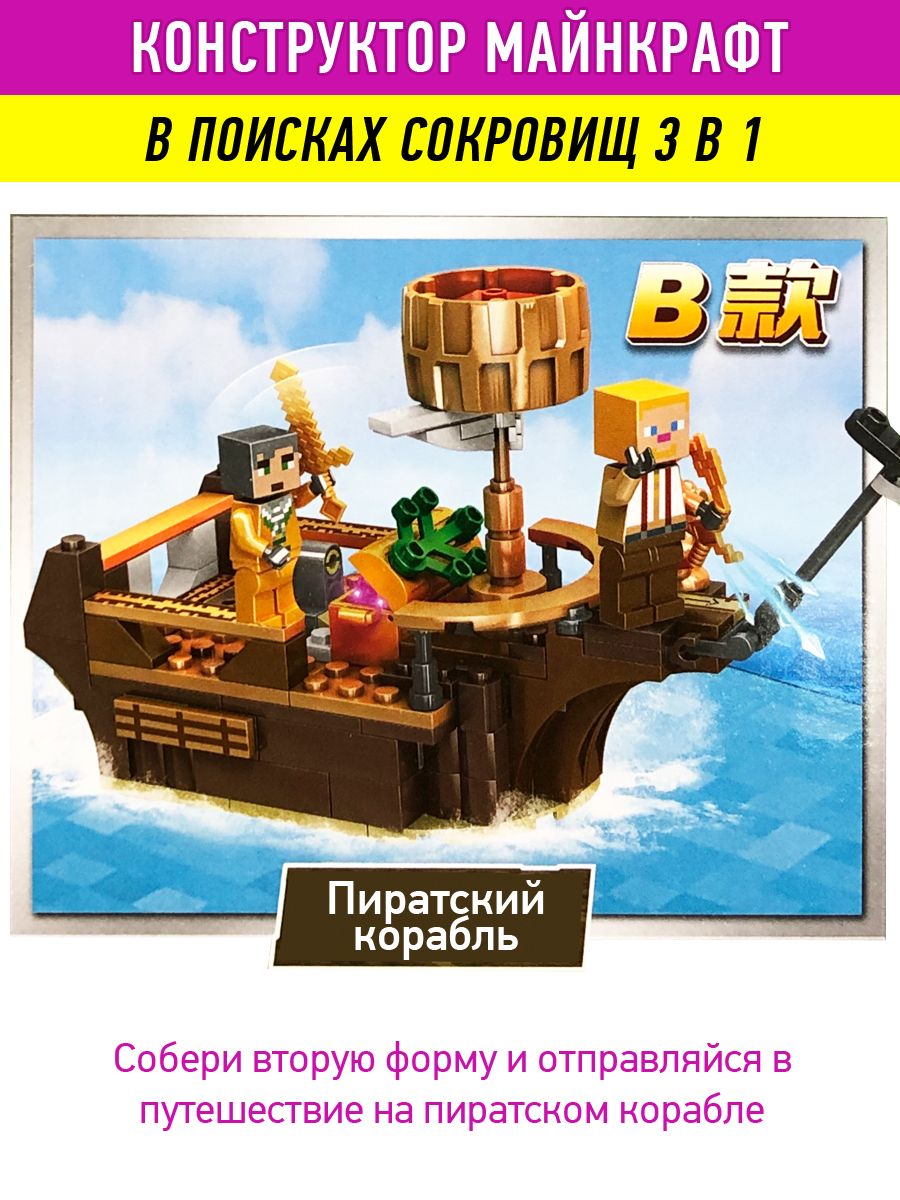 В наборе - 308 детали разного размера и цвета, из них ребёнок увлеченно будет собирать модель кораблей в стиле Майнкрафт, затем - придумывать интересные сюжетно-ролевые игры.