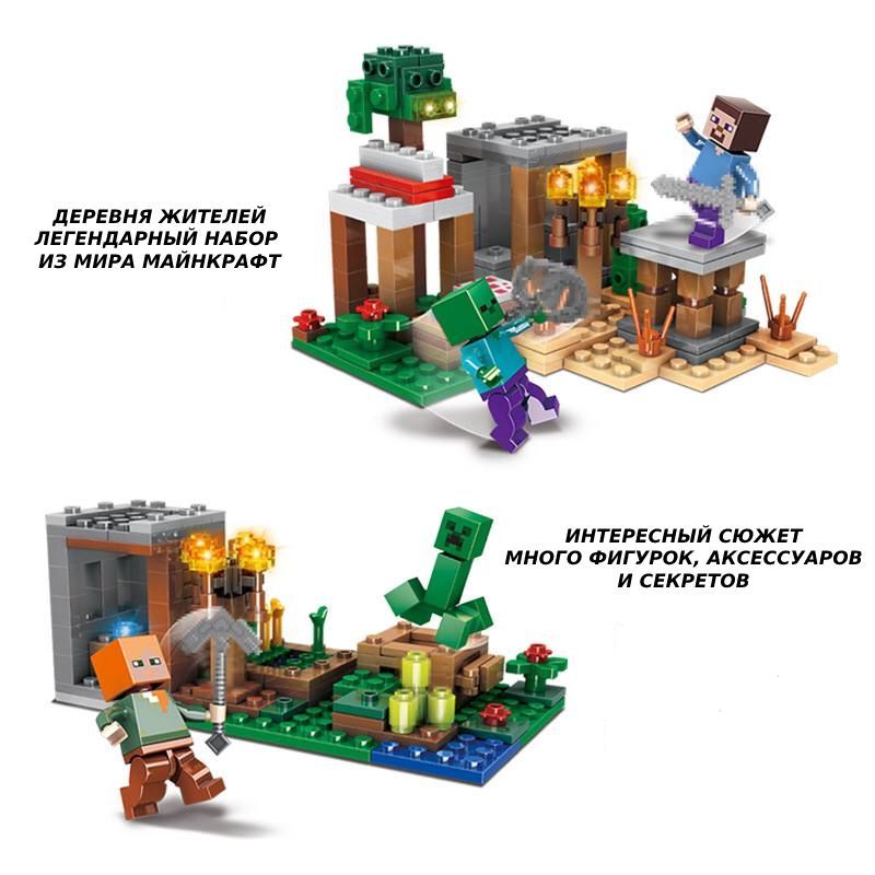 Основными героями этого набора являются Мирные Жители - люди, которые населяют деревню и выполняют различные задания. Эти фигурки выполнены с большим вниманием к деталям и полностью соответствуют внешнему виду персонажей из популярной игры Майнкрафт. Благодаря этой игрушке, ваш ребенок сможет самостоятельно создать свои истории и приключения в мире Майнкрафт.