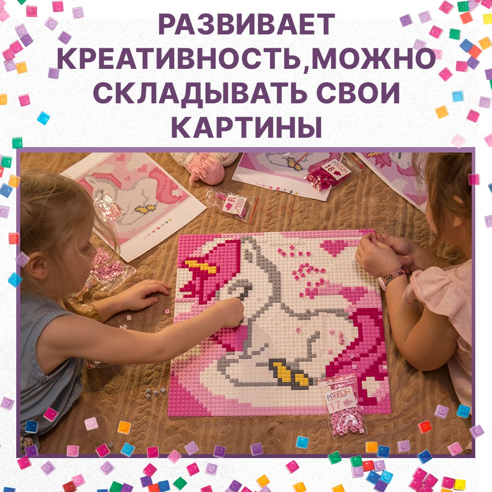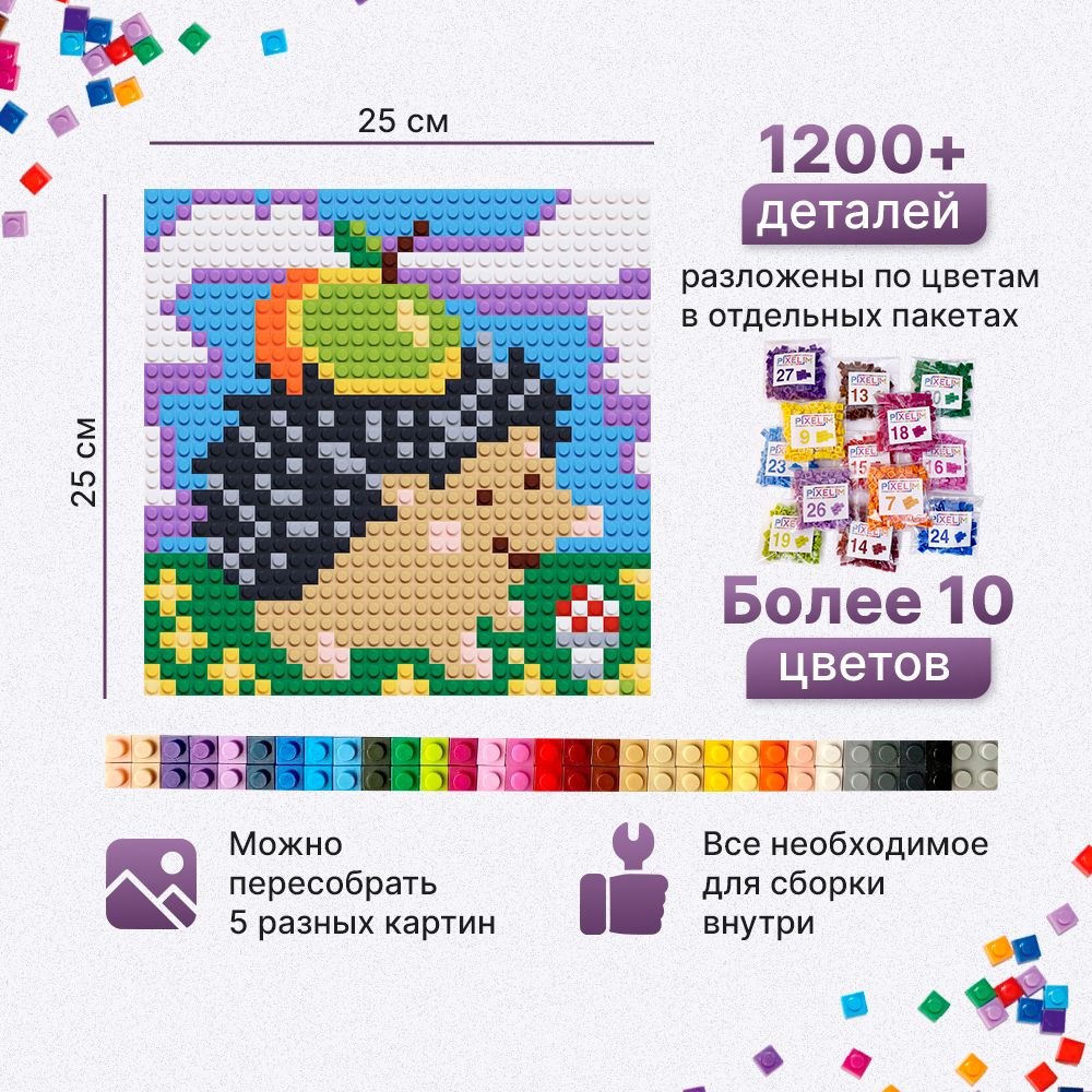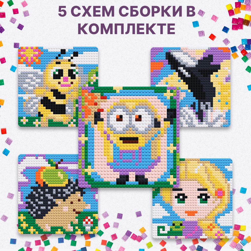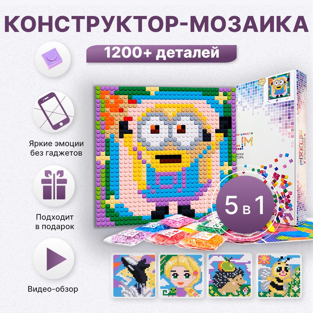 Конструктор-мозаика детский PIXELIM 5в1 1200+ деталей, 25х25см, 12 цветов