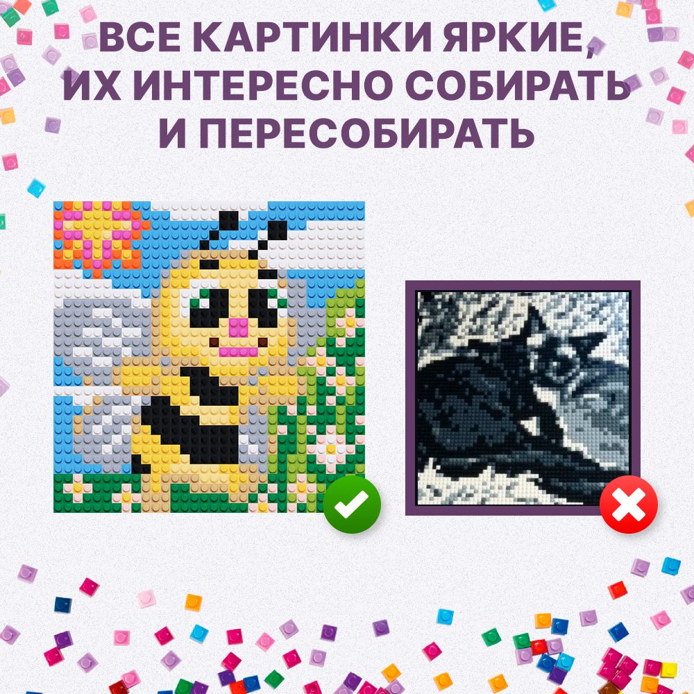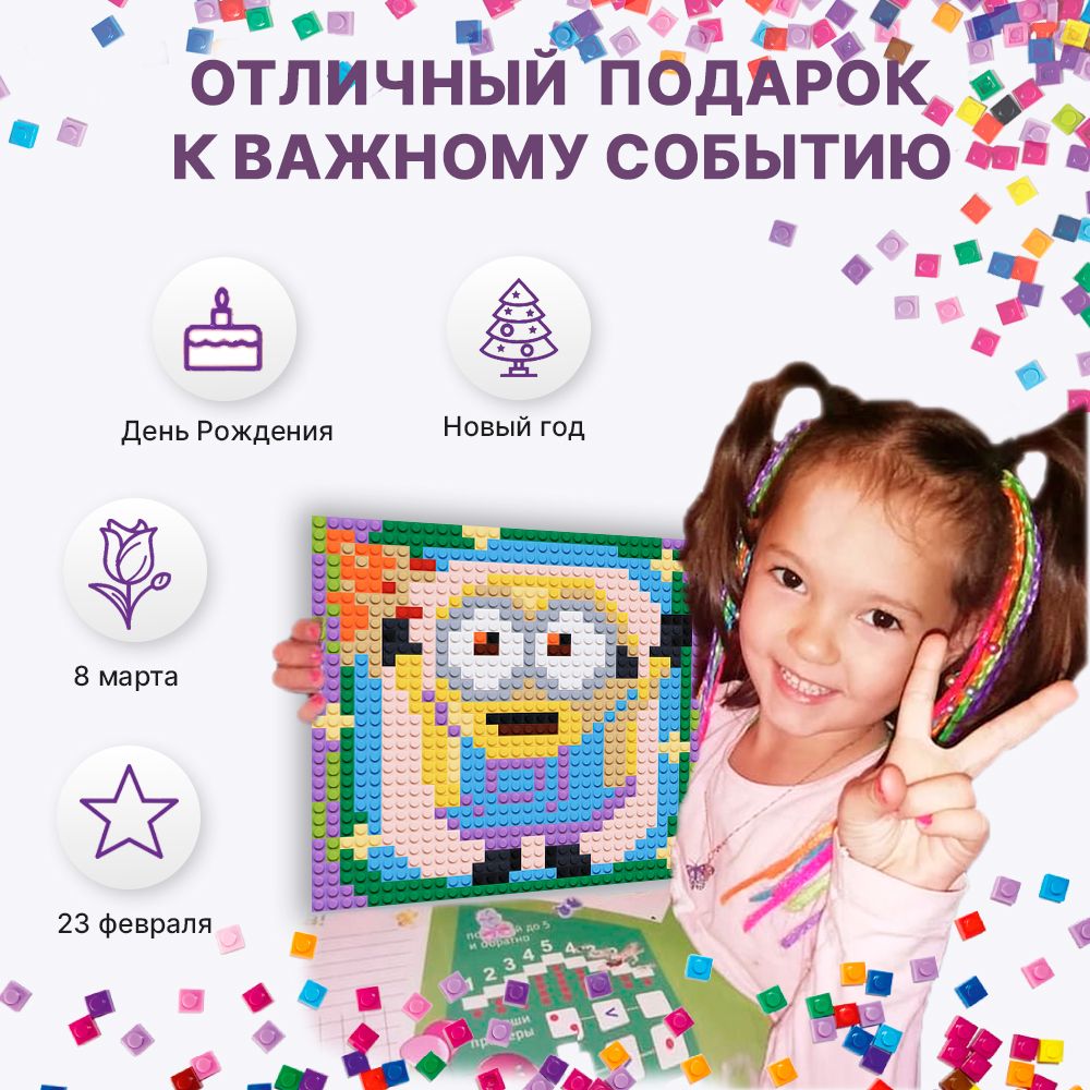 Описание: Сбор ярких картин-мозаик по номерам из деталей совместимых с лего подарит Вам яркие эмоции без гаджетов.  Все, что нужно уже есть в коробке. Отложите, телефон и планшет и займитесь созданием яркой картины-мозаики. Процесс сборки картины-конструктора развивает внимательность, мелкую моторику и успокаивает.