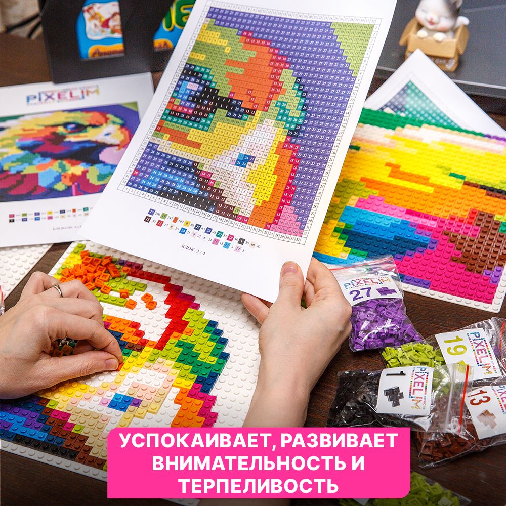 Конструктор-мозаику можно собирать как одному, а лучше совместно с семьей и друзьями. Среднее время сборки одной картины из 1024 деталей 30-90 минут в любом возрасте. Процесс за это время не надоедает и получается законченный результат, приносящий чувство удовлетворённости .  Для Вас подготовили 5 ярких авторских вариантов картин для сборки. Можно выбрать какую-то одну собрать и повесить на стену в виде красивой арт-объект для вашего интерьера на память об отлично приведённом времени. А можно разбирать и собирать бесконечное количество раз по распечатанным схемам или придумать свою.
