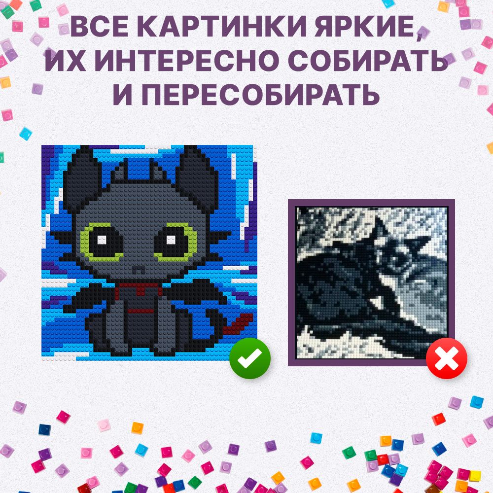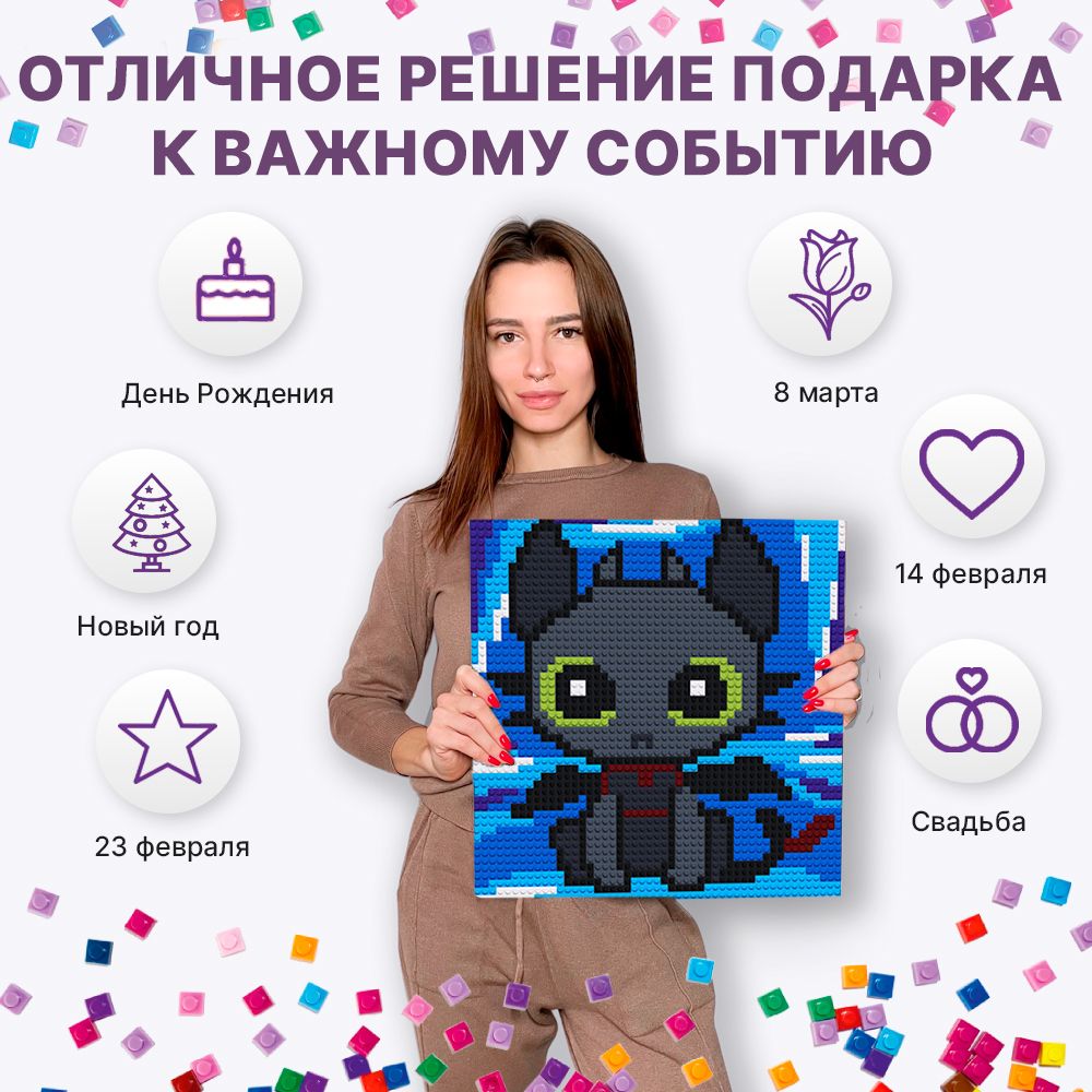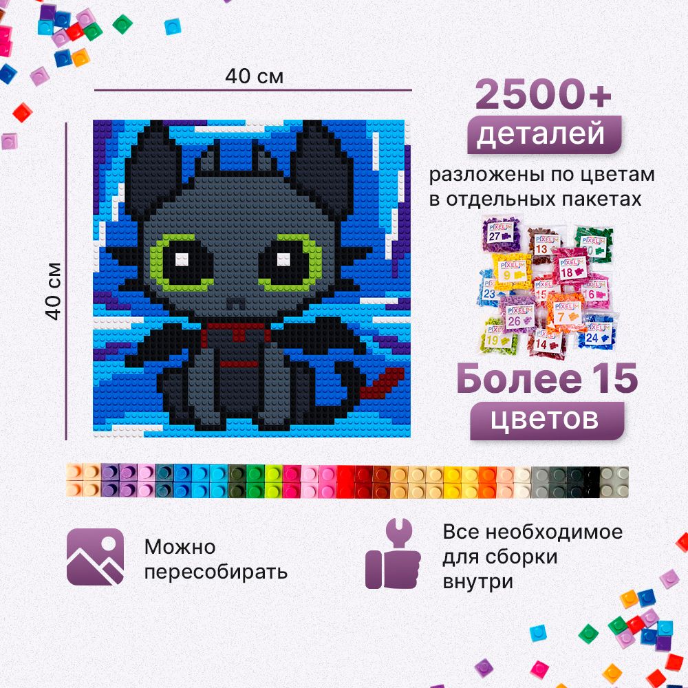 Конструктор-мозаика "Дракончик" PIXELIM, 40х40см, 2500 деталей, 11 цветов, картина по номерам из деталей совместимых с лего