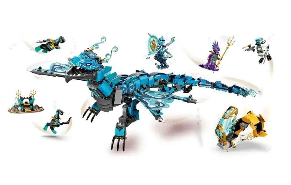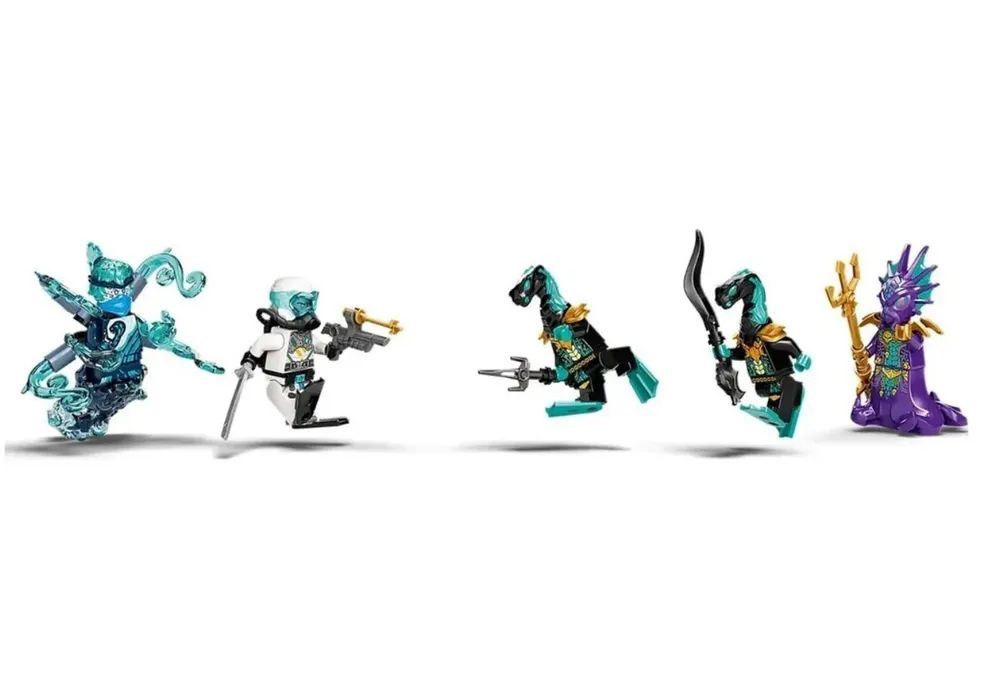 Описание: Длина водного дракона в собранном виде составляет 61 смПомимо внушительных размеров, у зверя есть несколько интересных функций, благодаря которым он имитирует движение в воде. У него подвижная голова и шея в нескольких местах, он легко передвигает своими конечностями, а нажав на деталь, расположенную у него на спине, приводятся в движения его огромные крылья.Все фигурки детально проработаны, имеют свой оригинальный принт и дополнительные аксессуары. Также у Зейна есть собственная субмарина с подвижными закрылками и вращающимся задним элементом, который выполняет роль пропеллера.